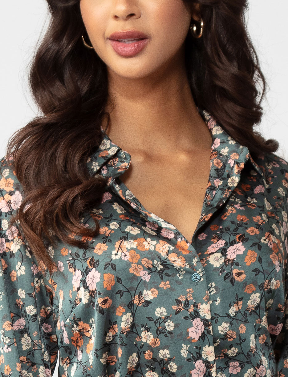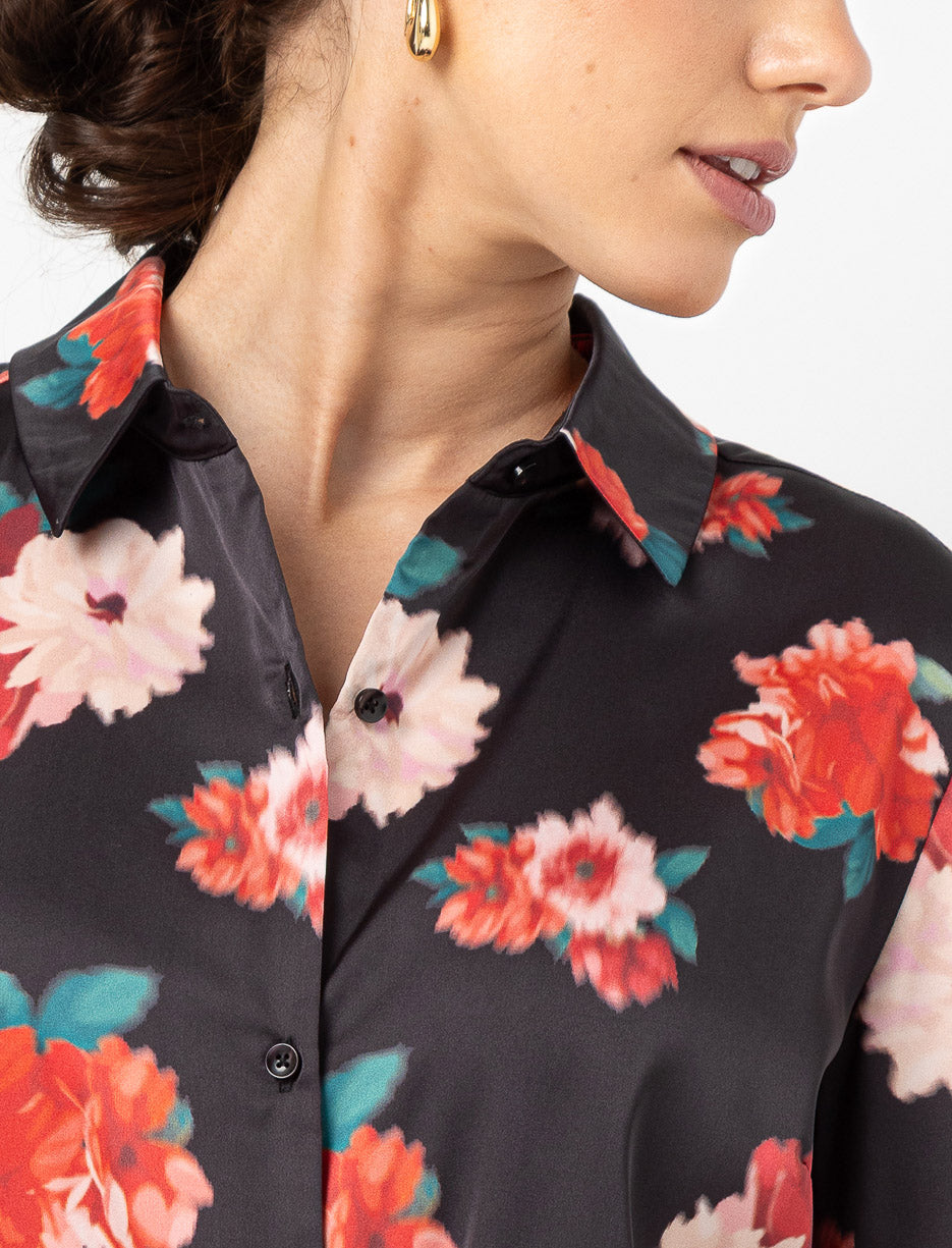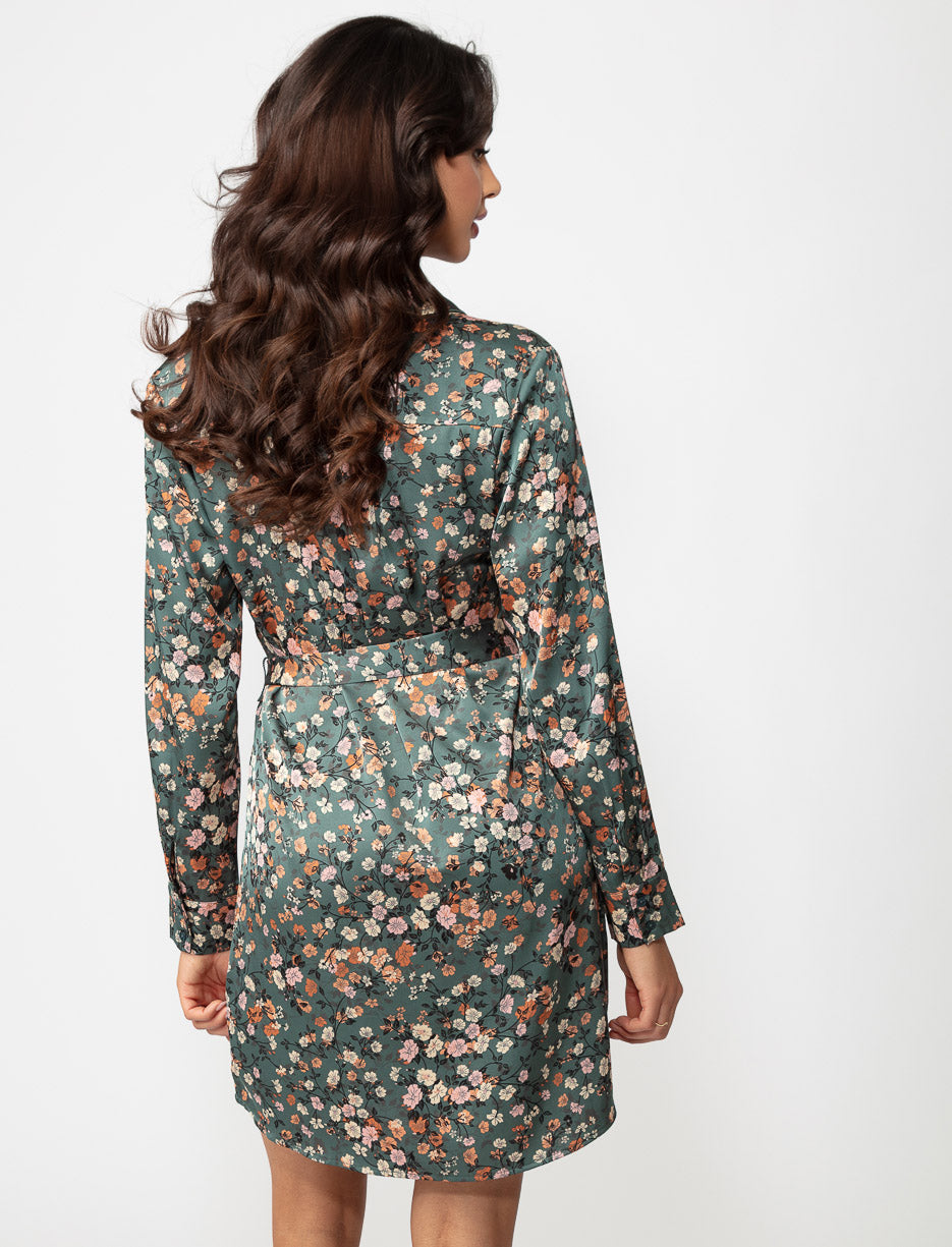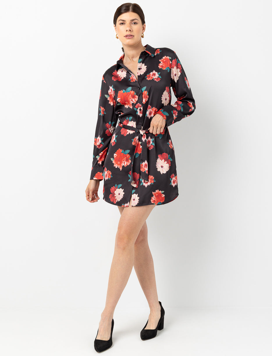 This satin shirt dress combines style and comfort, featuring a flattering tie-waist design and a vibrant floral print. Perfect for both daytime and evening events, it adds elegance to any look.