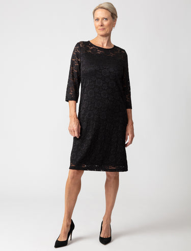 Crafted to captivate, this short dress offers an elegant allure with its detailed lace. Designed with comfort in mind, it features a graceful knee-length cut and soft, stretchy fabric that contours gracefully.