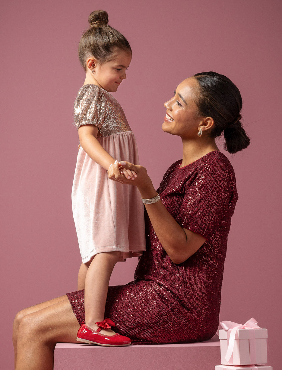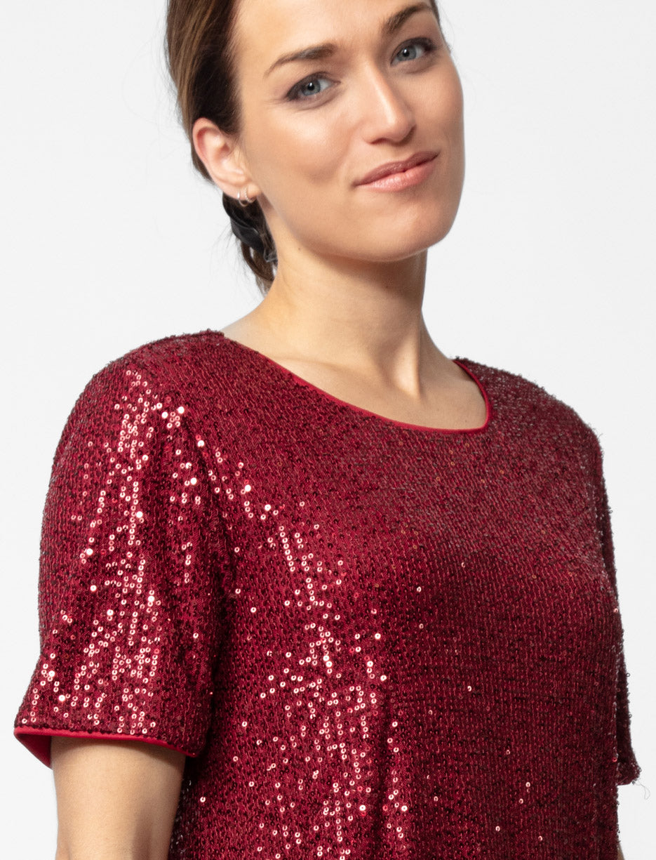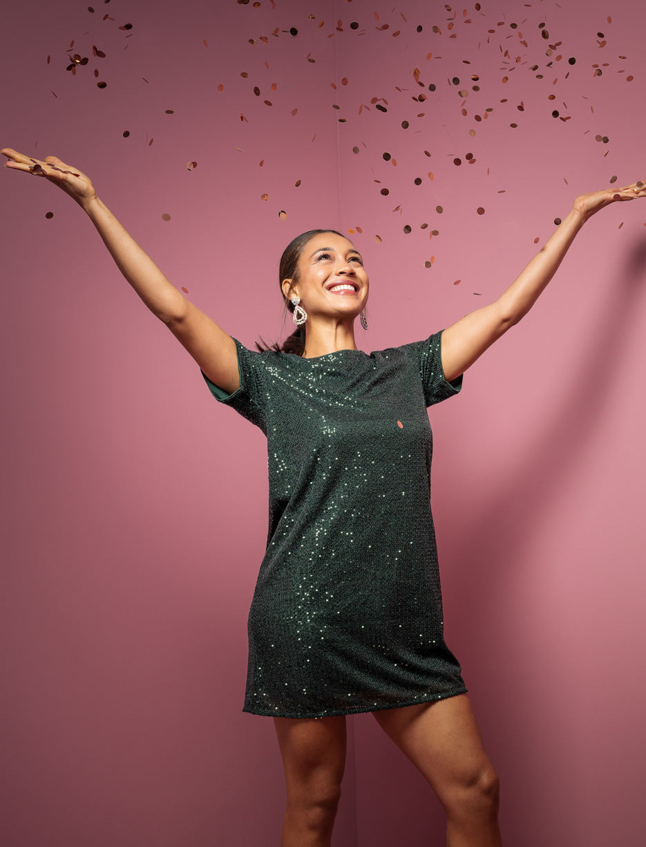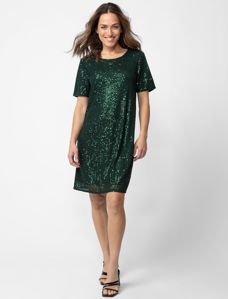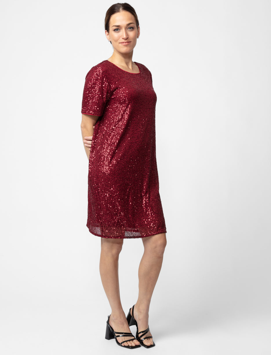 This glamorous sequin dress is the perfect statement piece for any festive occasion. With a comfortable shift silhouette and knee-length, it combines sophistication with sparkle.