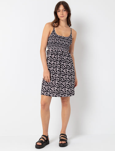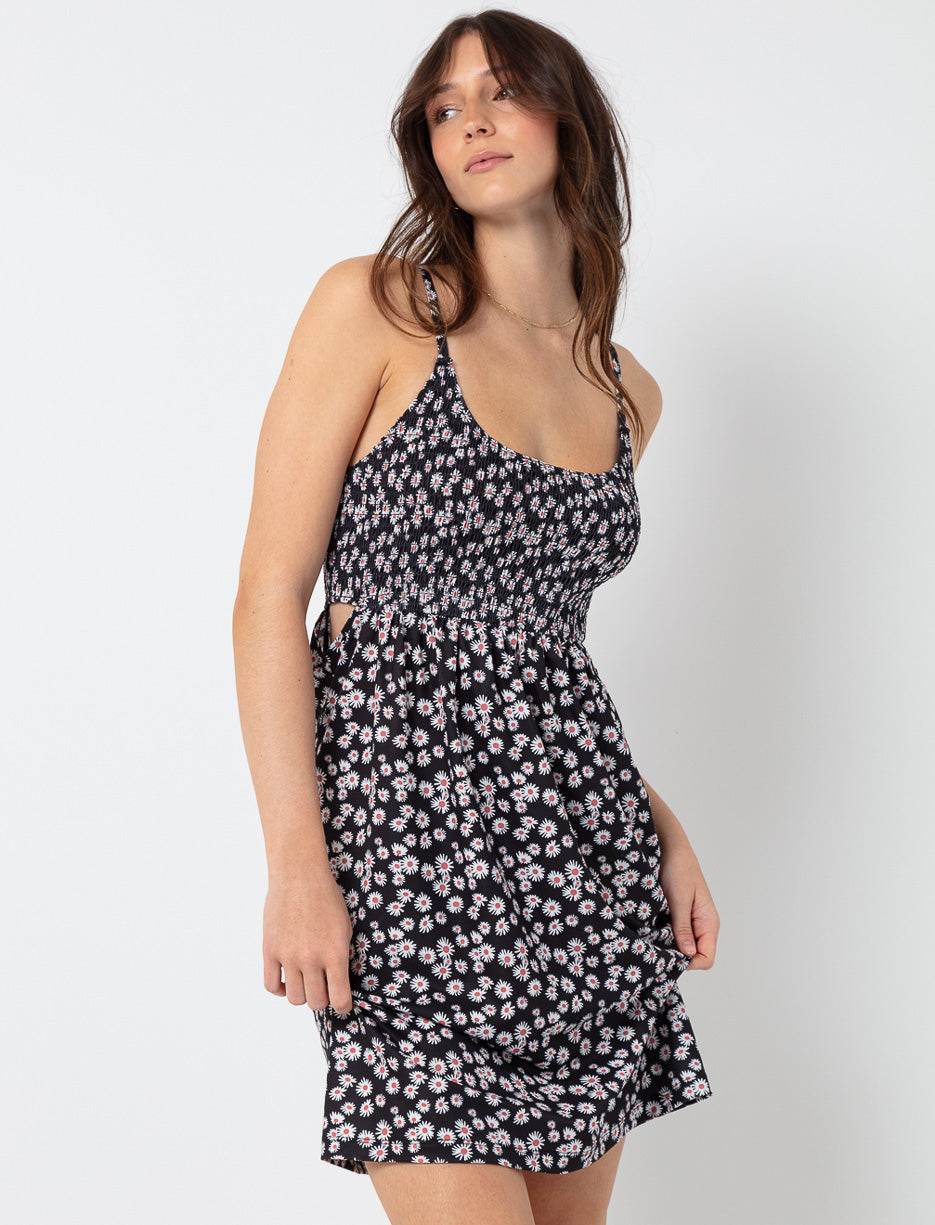 This playful sundress is perfect for warm days with its lightweight fabric and flattering smocked bodice. The delicate floral print and cut-out details add a touch of irresistible charm.