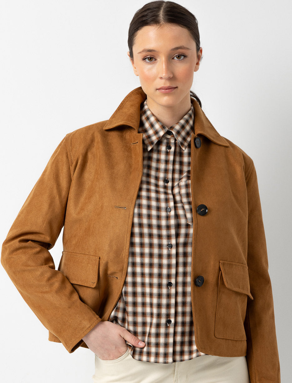 A timeless short jacket, perfect for elevating your fall outfits. Featuring a shirt collar and flap pockets, it strikes the perfect balance between polished and casual.