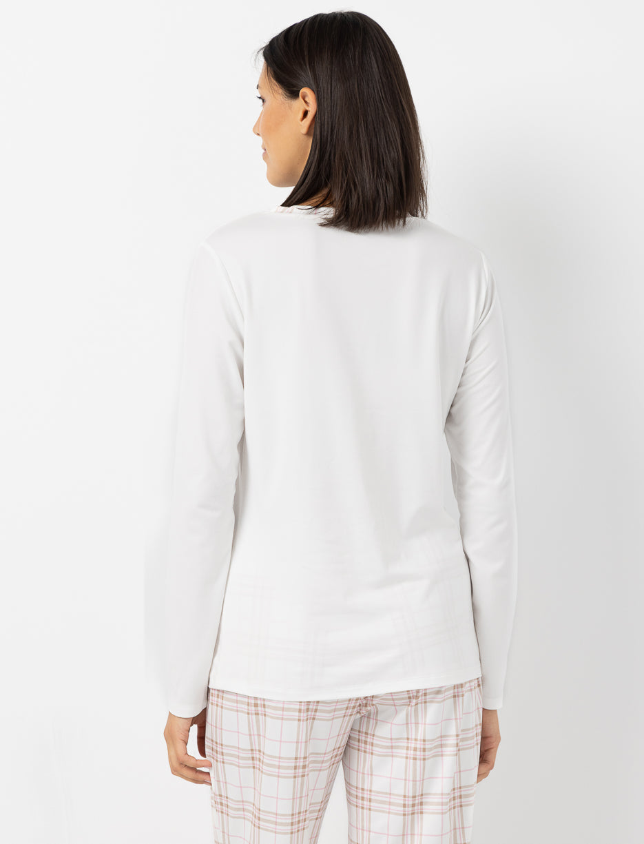 Slip into comfort with this long-sleeve PJ t-shirt, featuring a plaid pocket for a soft and charming touch.