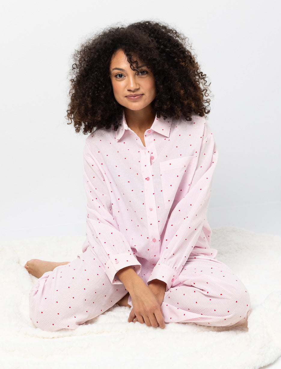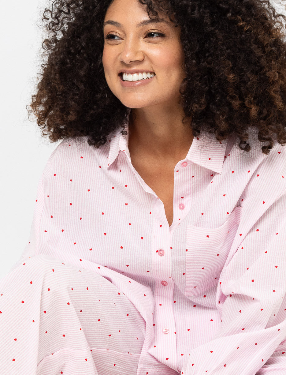 A PJ blouse designed for winding down. Small heart details add a delicate touch, while the button-front style makes it easy to wear for relaxed moments at home.