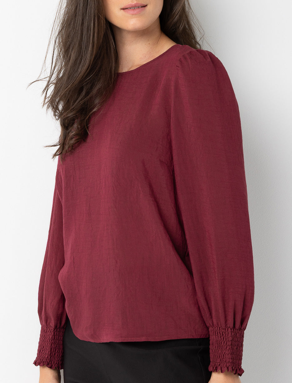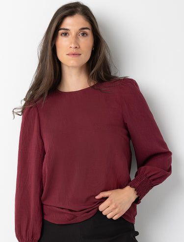 Elevate your look with this textured long-sleeve blouse featuring smocked cuffs that add a touch of effortless elegance.