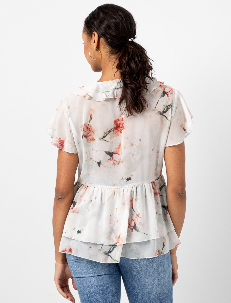 Lightweight blouse with ruffles, short sleeves, and a V-neckline. Features front tie cords and an all-over floral print, adding a feminine and elegant touch to everyday outfits.