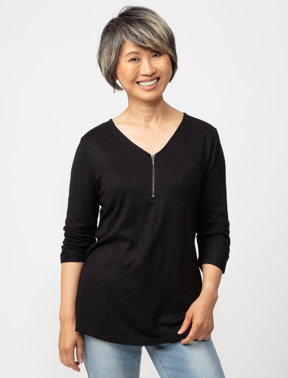 This stylish sweater features a flattering V-neckline with a chic zipper detail, adding a touch of elegance to your everyday attire. Its soft material and comfortable fit make it an excellent choice for any season, ensuring both warmth and fashion.