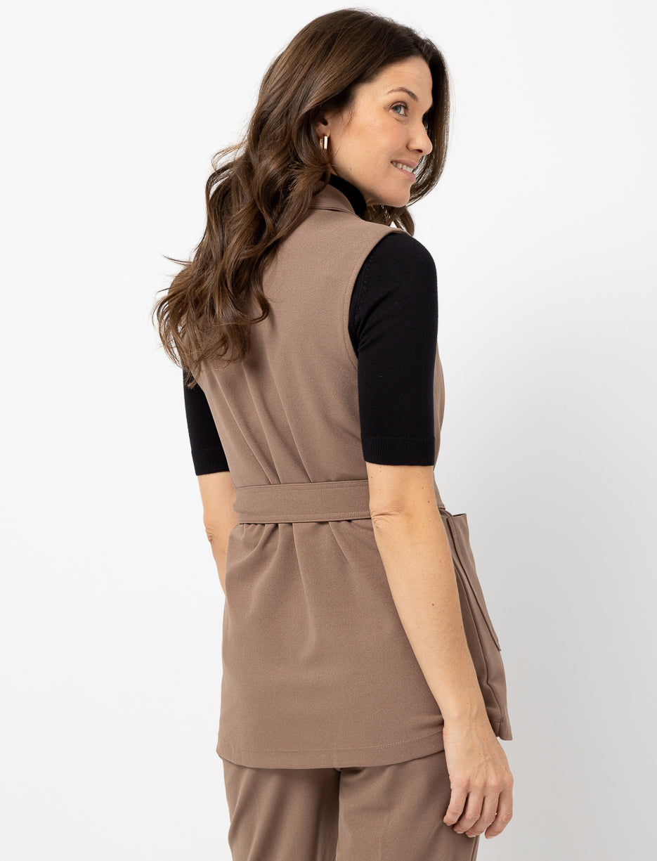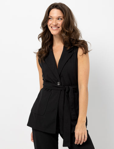 This sleeveless blazer blends chic and comfort with its belted design and practical large pockets. A versatile piece that elevates your outfits with ease.