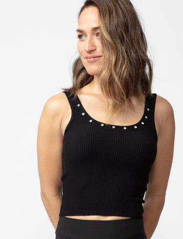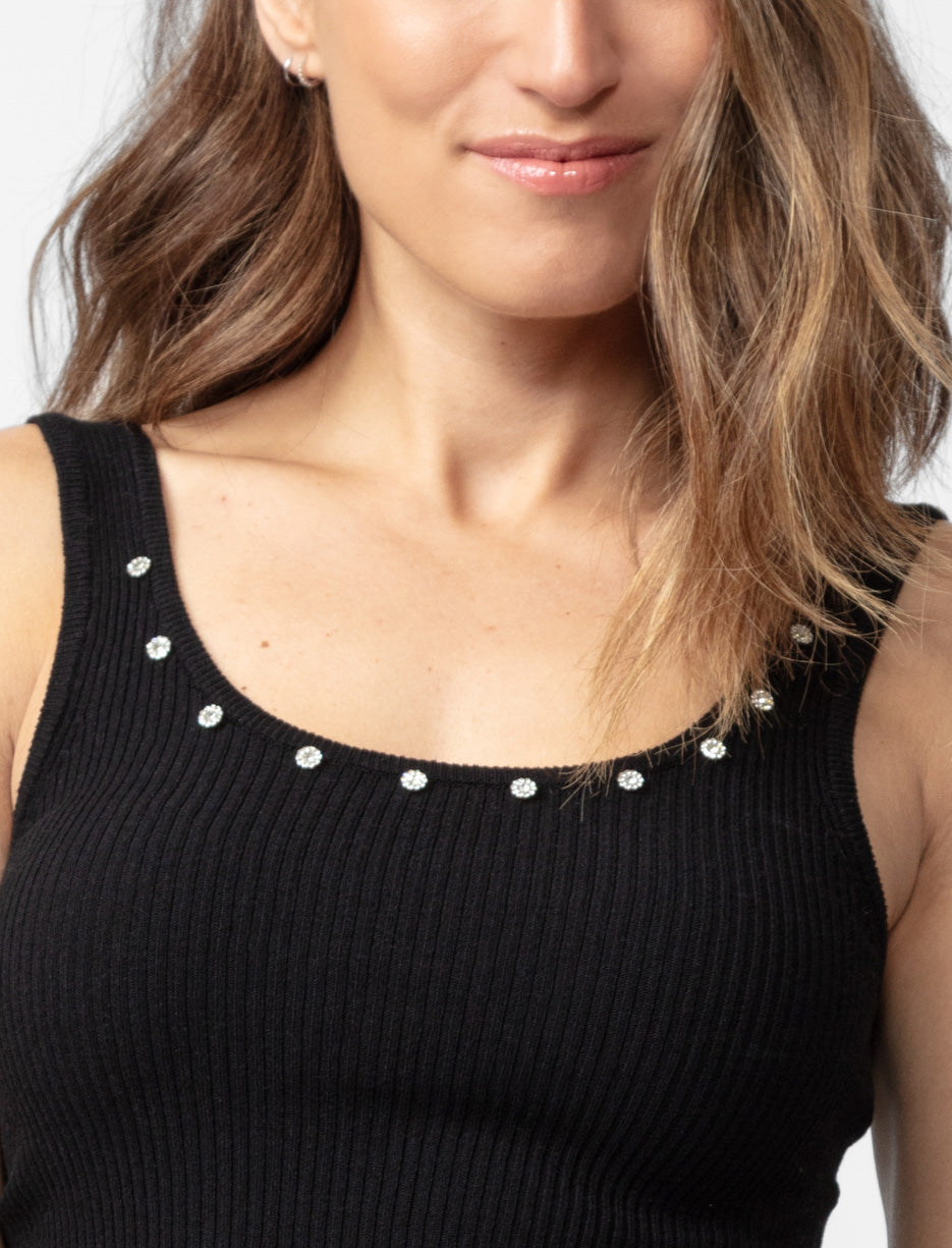 This stylish tank top is adorned with delicate rhinestone detailing along the neckline, offering a touch of elegance to a classic piece.