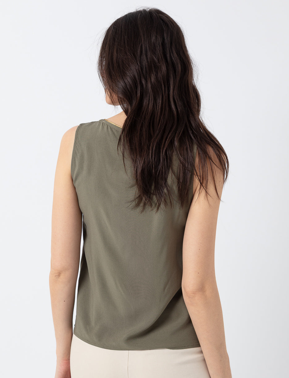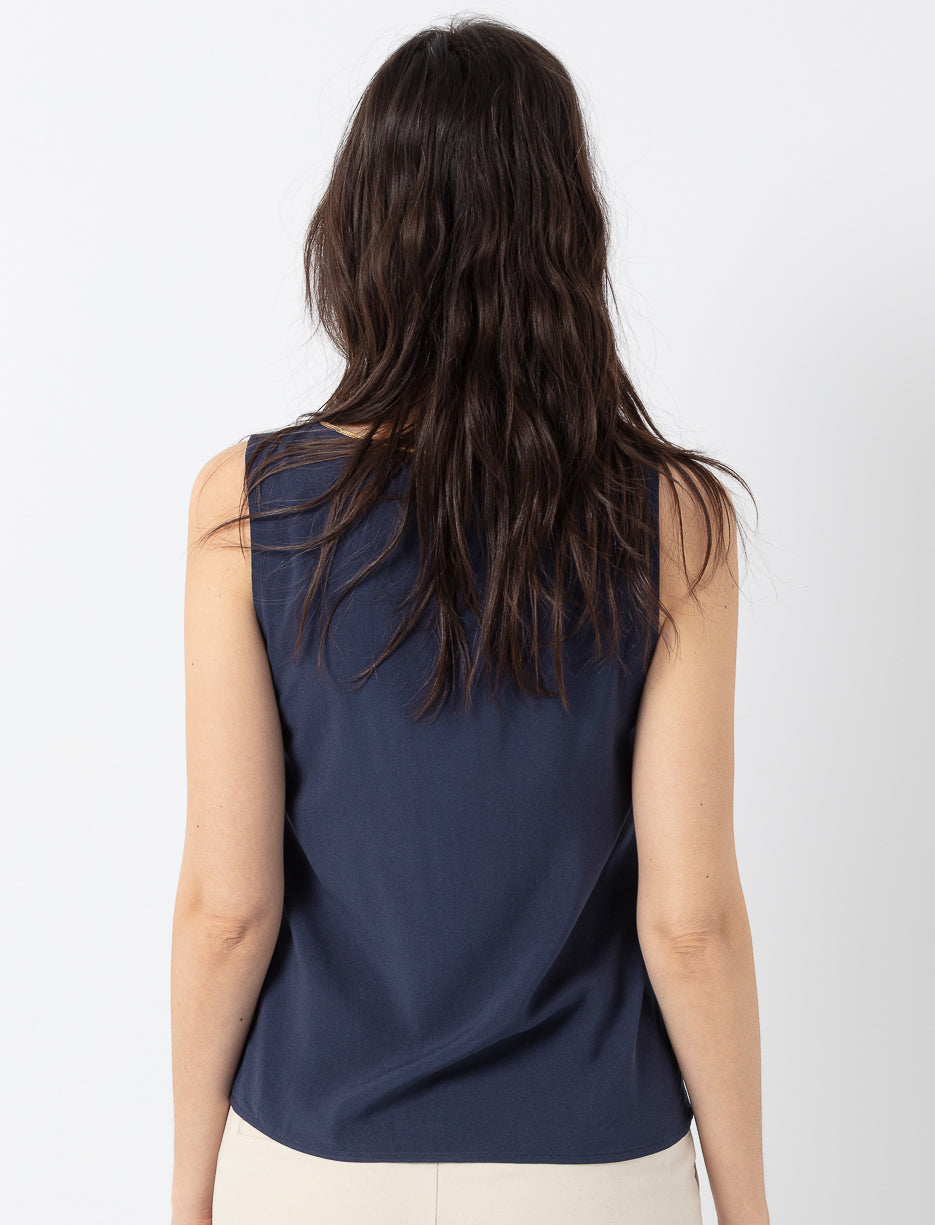 A chic V-neck tank top with subtle detailing, perfect for elevating any outfit with effortless style.