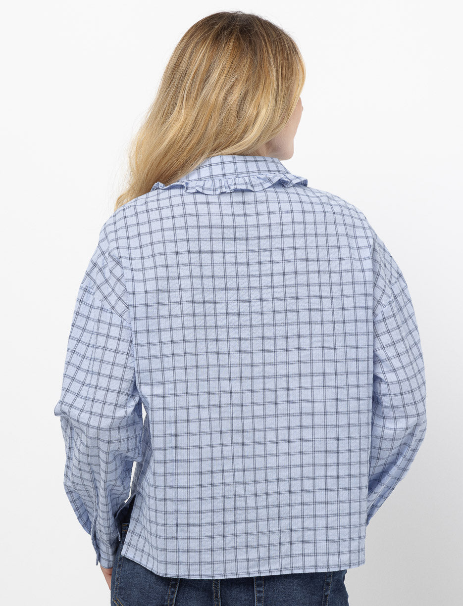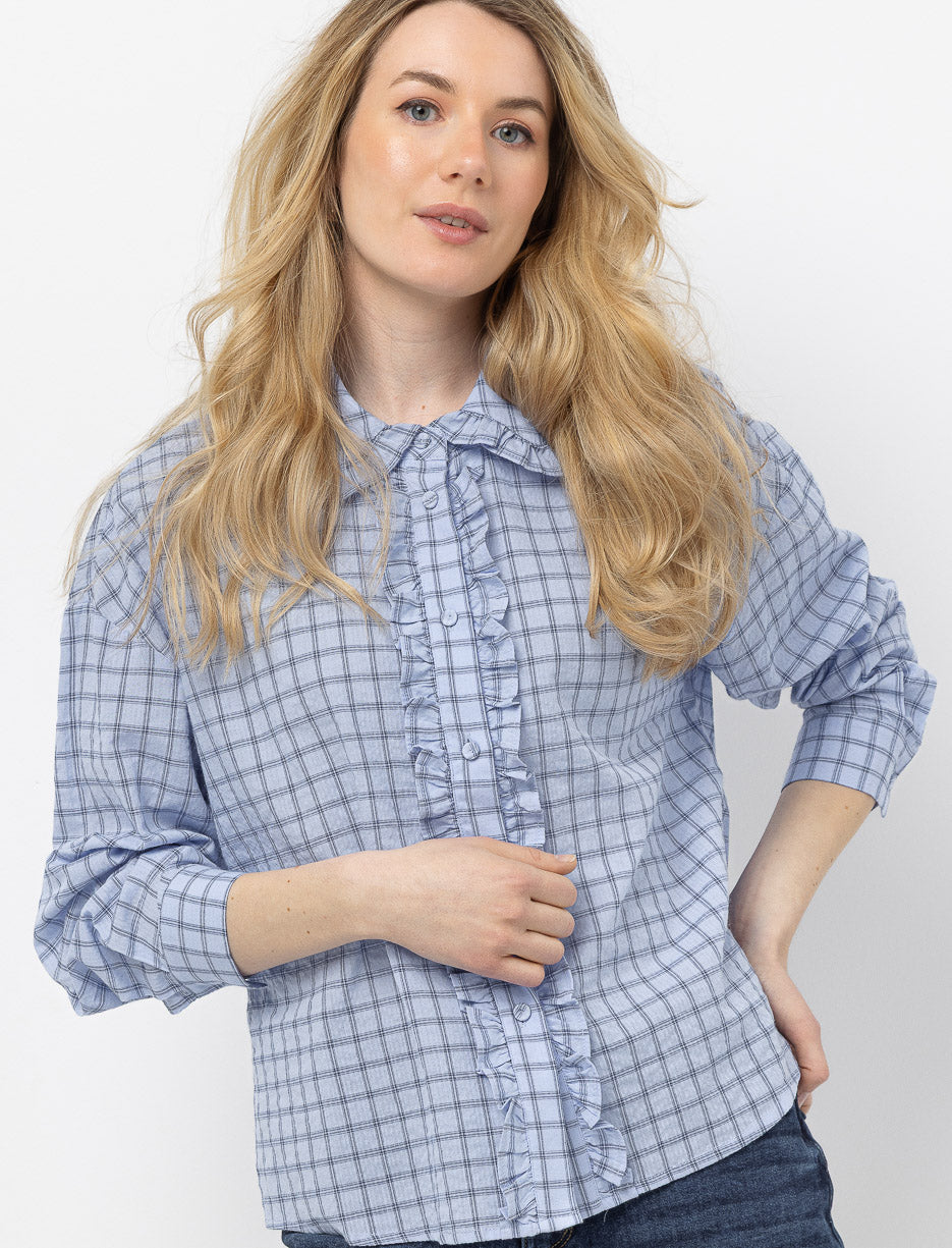 Featuring subtle frill details along the button placket and a soft checked pattern, this shirt is both comfortable and stylish. Wear it open or buttoned up to suit your mood.