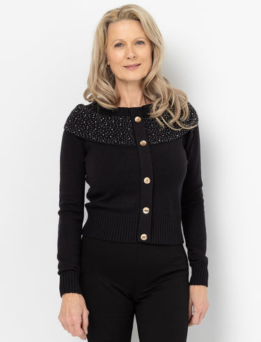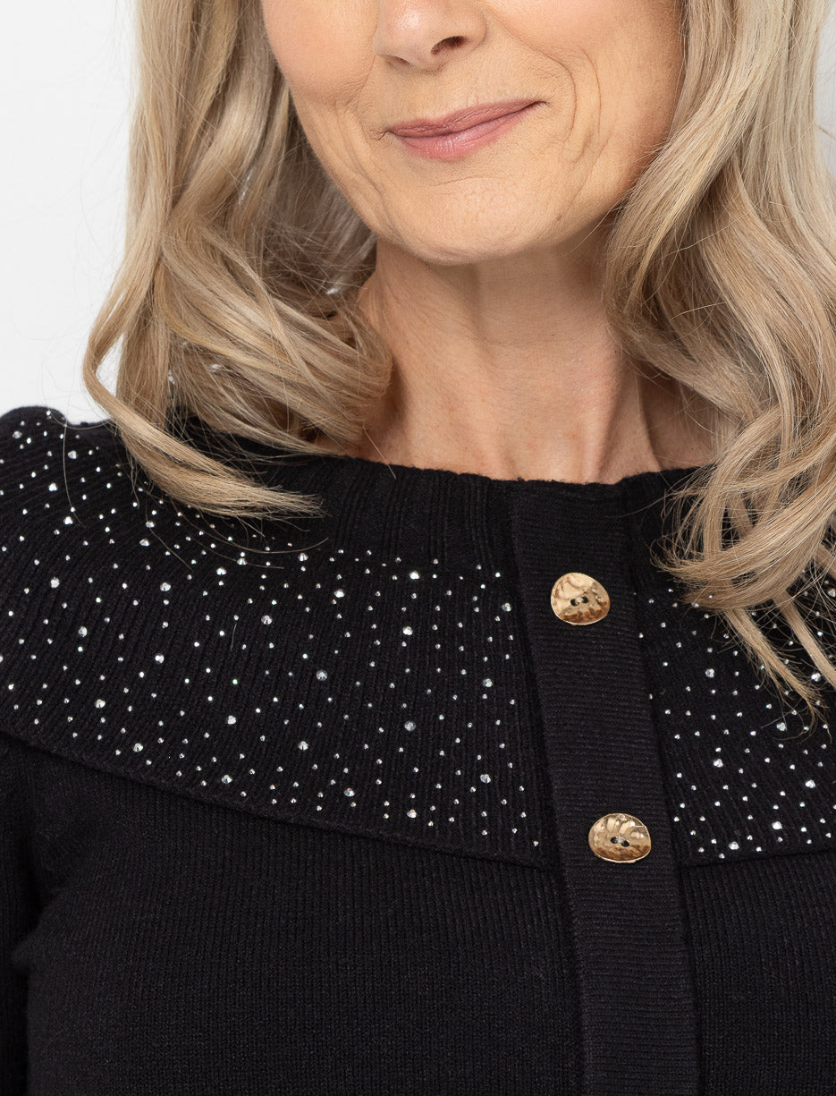 An elegant cardigan that catches the light with delicate rhinestones, finished with contrast buttons and soft knit for effortless comfort and style.