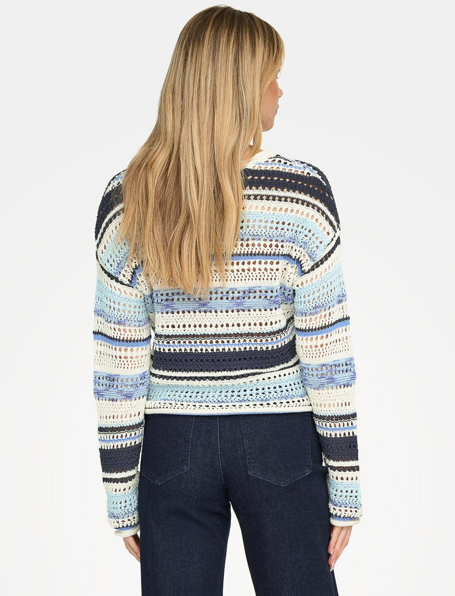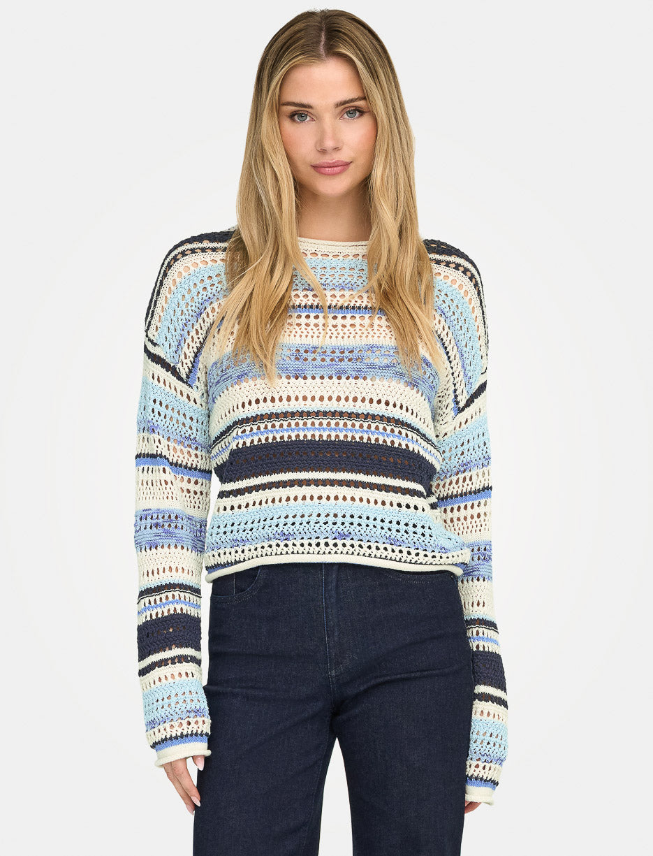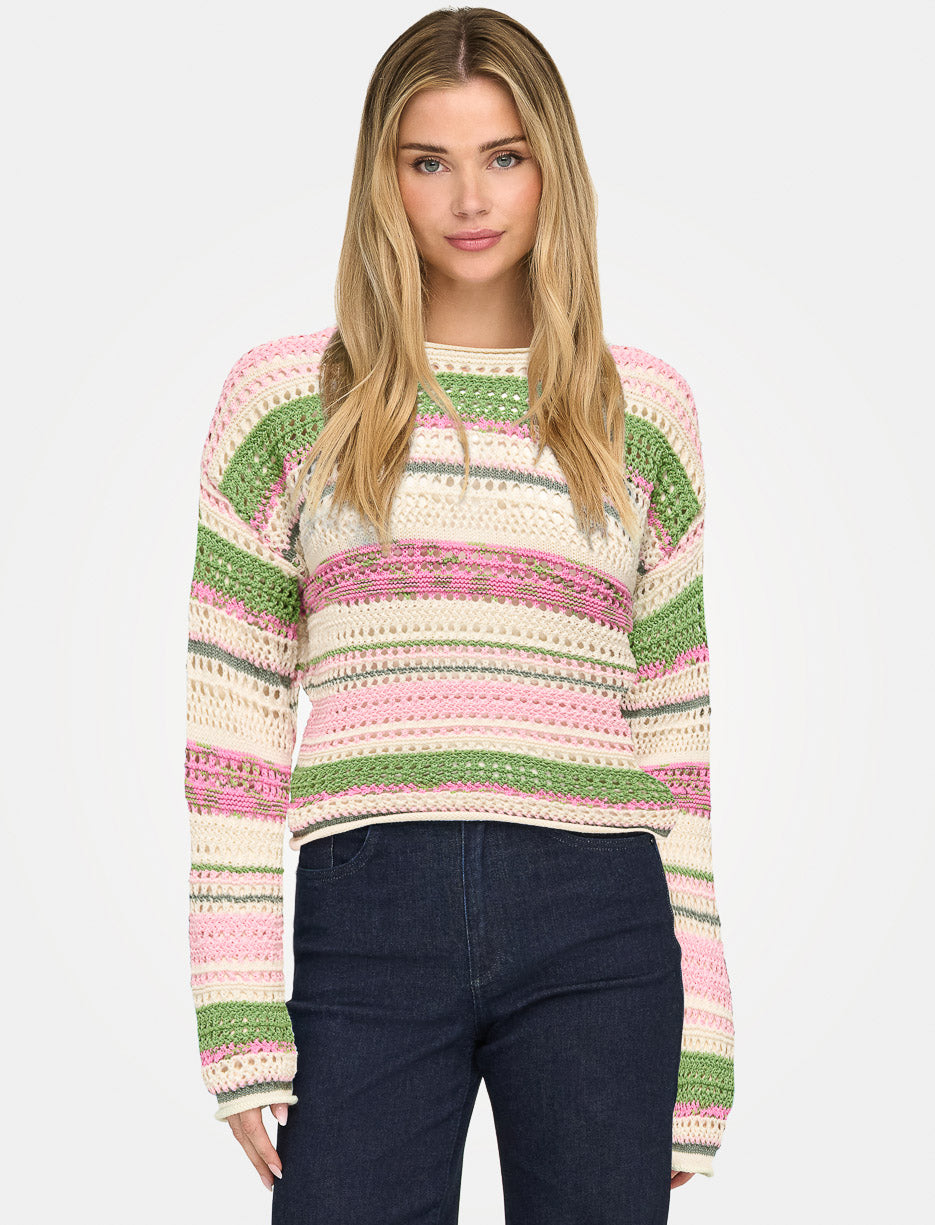 A crochet sweater featuring soft stripes and a classic crew neck. The dolman sleeves add an easy, relaxed touch, making it a comfortable go-to piece for laid-back everyday outfits.