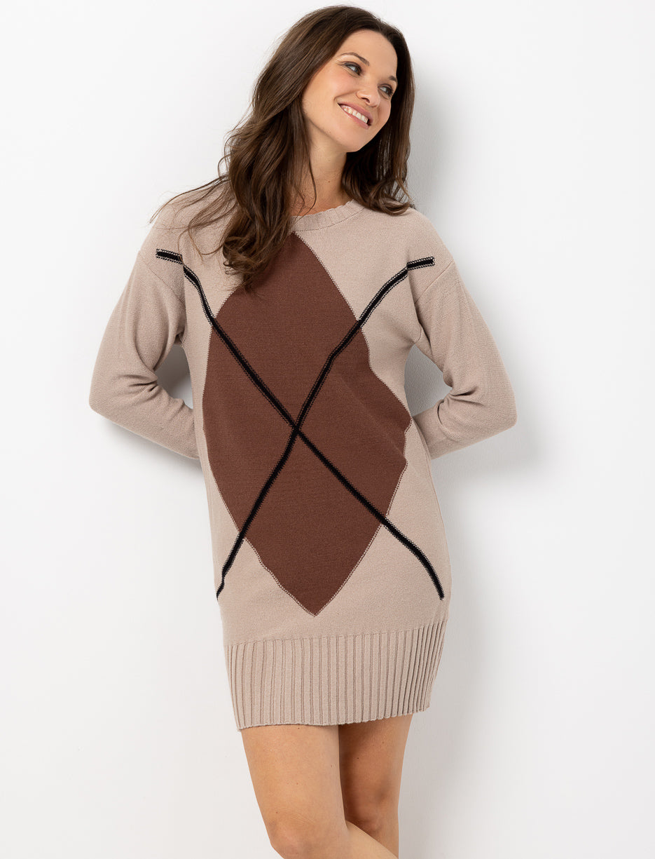 Show off a look that’s both classic and trendy with this knit dress. The bold argyle pattern adds a unique graphic touch to a comfortable and elegant piece.