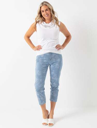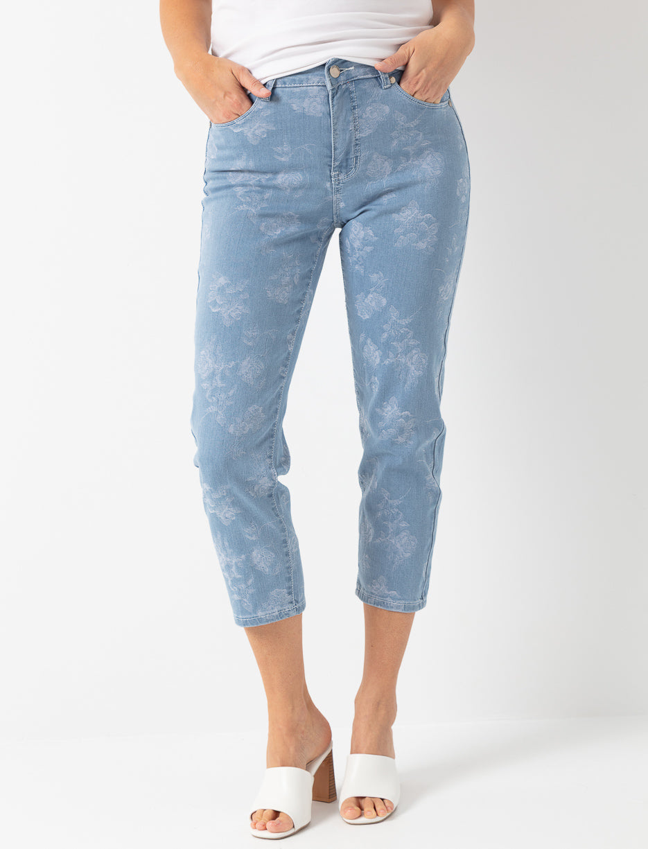 Denim with a delicate twist! These cropped jeans combine comfort with a subtle floral touch for a unique, feminine look. Perfect for casual days or dressing up with ease, they bring a soft elegance to everyday style.