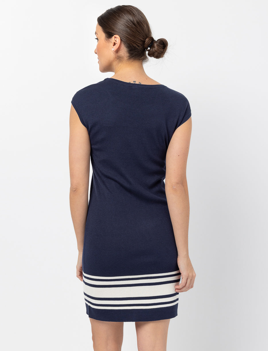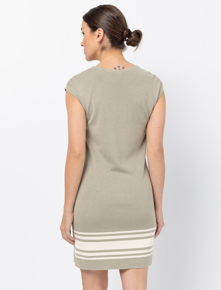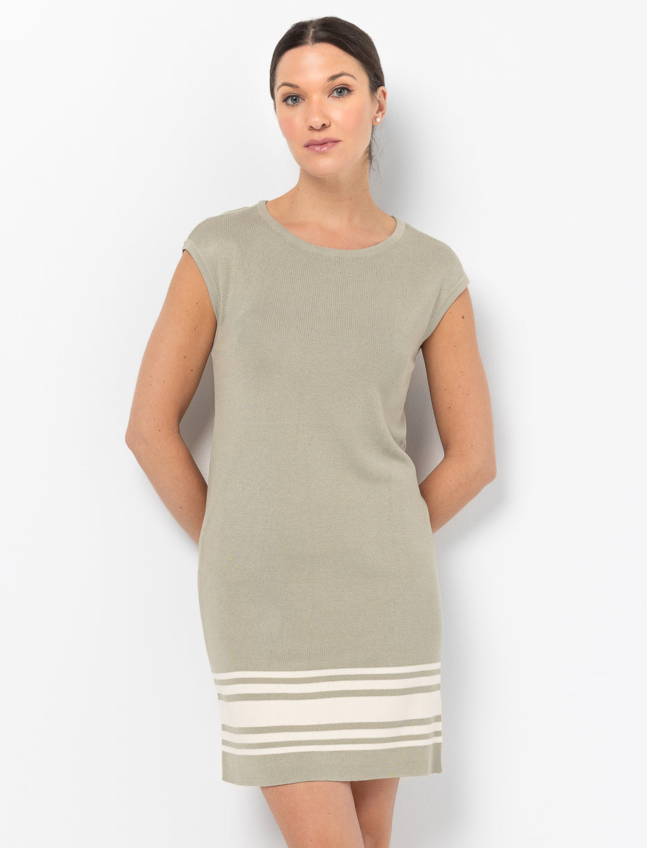 This sleeveless dress features a clean cut and subtle bottom stripes for a fresh, easy look. Light and comfortable, it fits perfectly into your sunny-day plans.