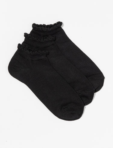 A soft daily essential: this trio of white ankle socks with scalloped trim blends comfort and charm. An easy match for any outfit.