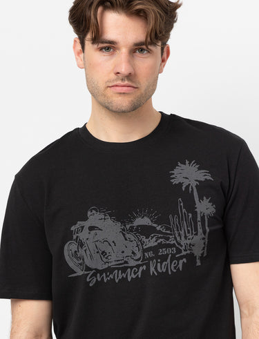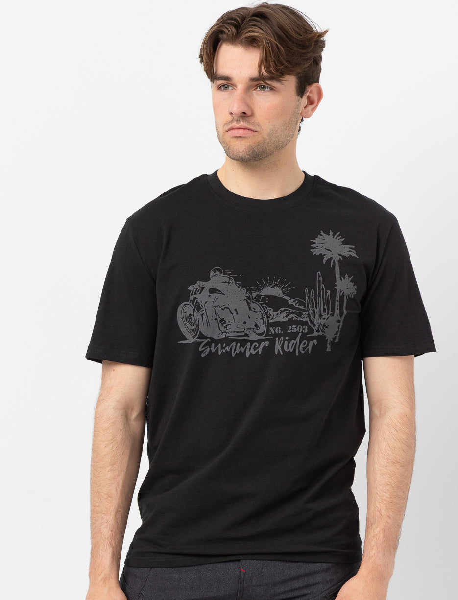 This T-shirt captures a spirit of adventure with its motorcycle and palm tree graphic. A nod to summer escapes, perfect for laid-back, confident style.