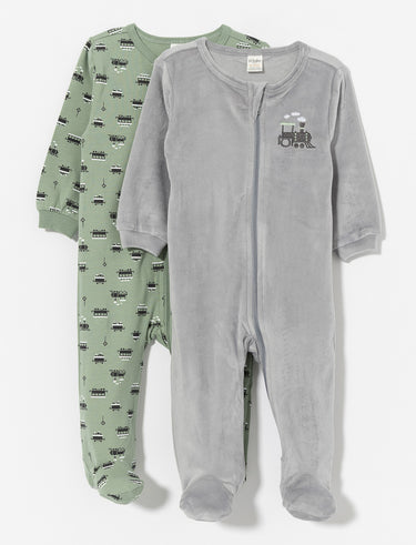 Pack of 2 footed onesie pjs with full-length zipper. Includes one thermal velour style for extra warmth and one printed cotton style for everyday comfort.