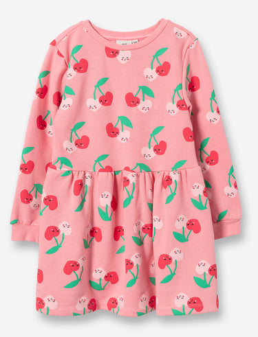 This adorable fleece dress for little girls combines style and comfort! With its round neck, ribbed sleeves, and flattering waistline, it's perfect for playing and having fun. The cute cherry print adds a touch of whimsy to her wardrobe.