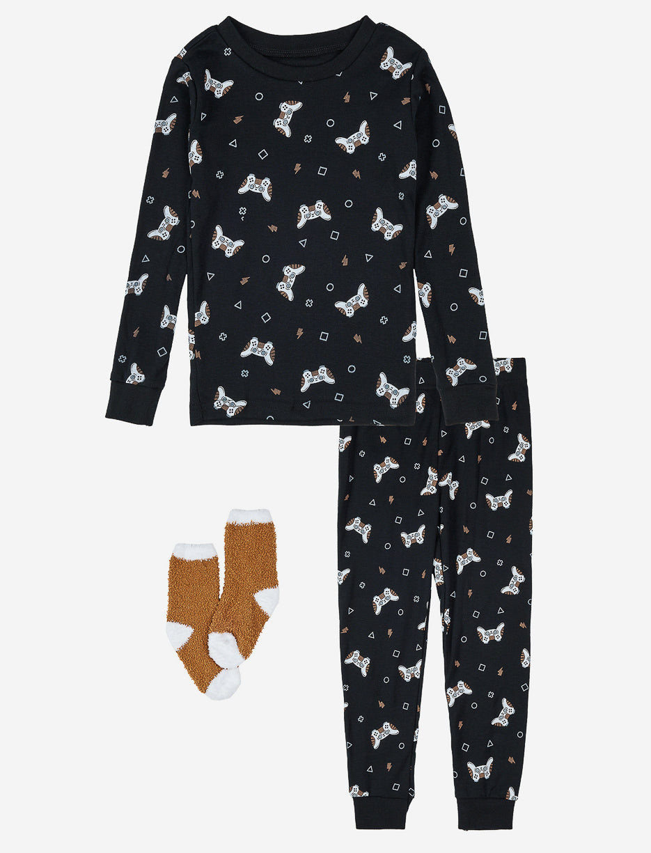 Your boy stays cozy in this 2-piece pajama set. The playful print and elastic waistband provide comfort and ease, while the matching socks complete the look.
