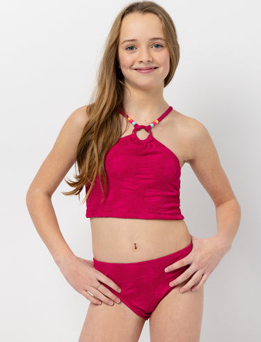 This teen two-piece bikini features a top with a neck ring and adjustable thin straps detailed with small beads. The matching bottom offers a comfortable fit, perfect for beach or pool days.