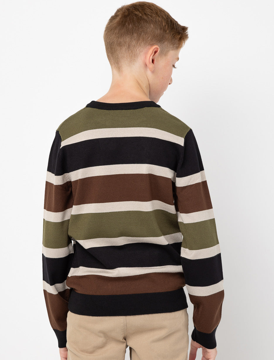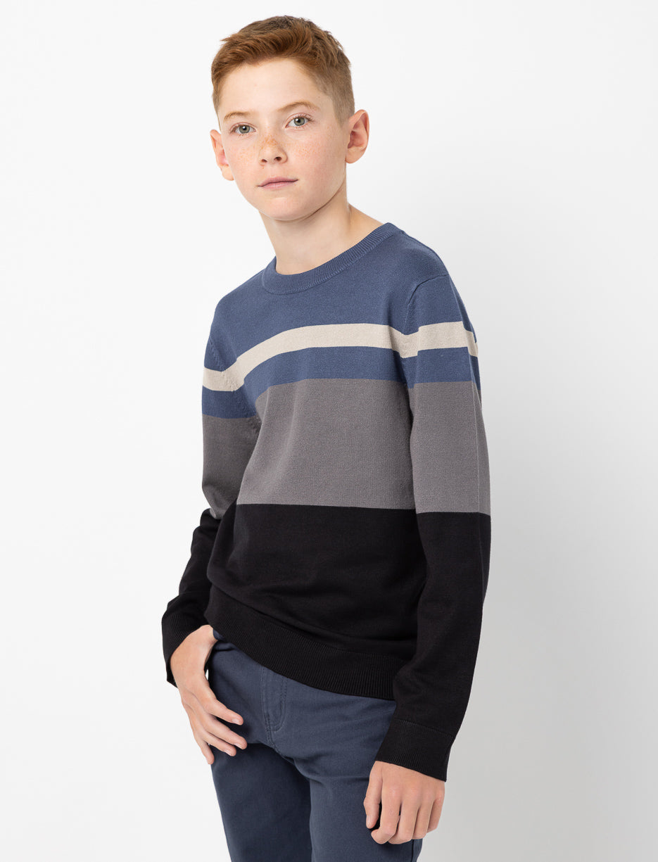 This striped knit sweater is a practical and stylish choice. Comfortable and easy to pair, it’s perfect for school or casual outings.
