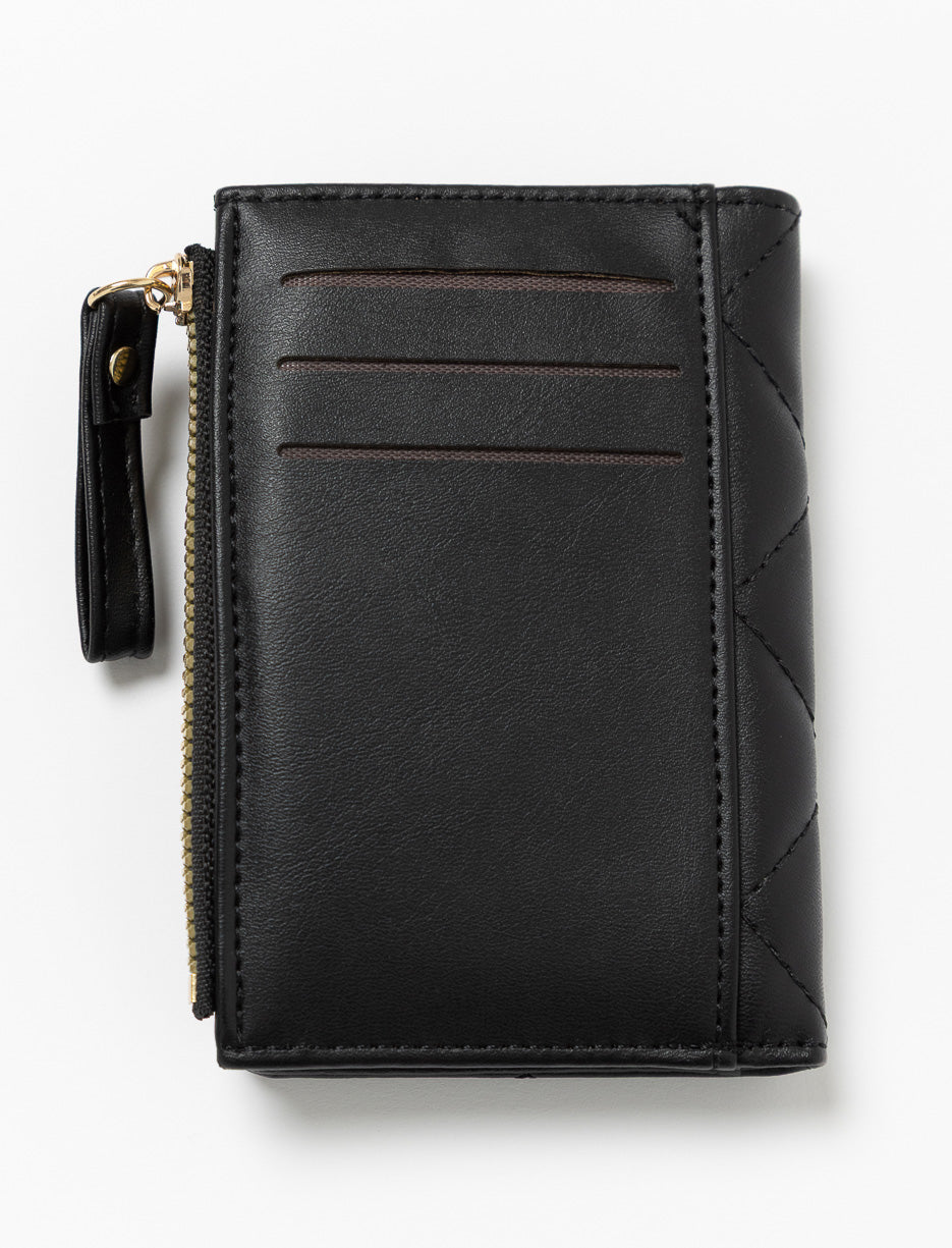 A compact quilted wallet with elegant style. Featuring a secure zippered pouch and multiple card slots to keep your essentials neatly organized.