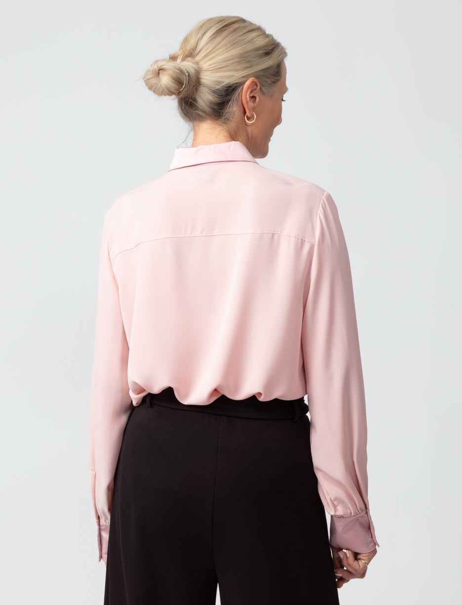 This elegant blouse, with its flowing fabric and refined button-down design, pairs beautifully with both formal and casual looks, providing a graceful silhouette for any occasion.