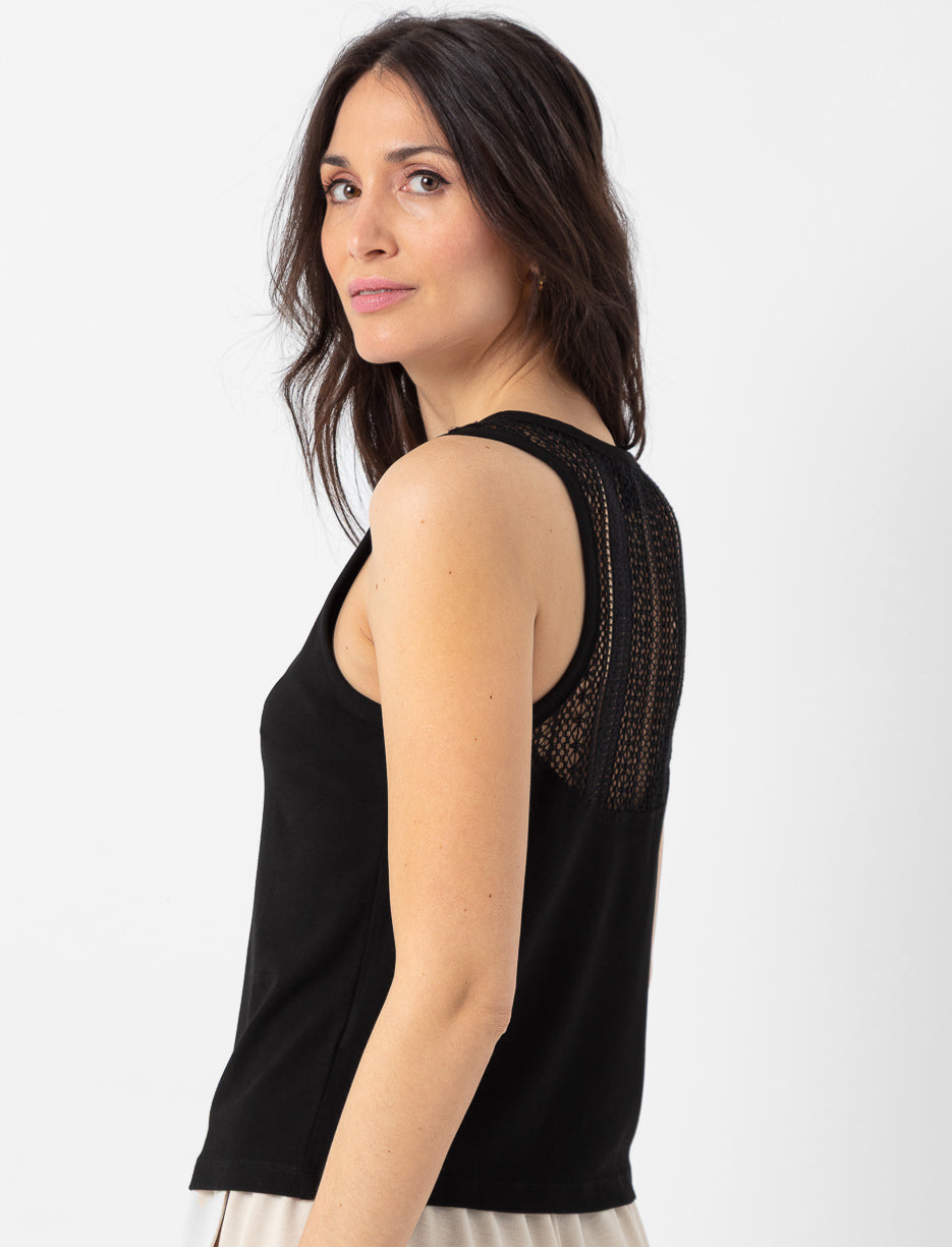 Simple in the front, surprise in the back! This tank top adds a refined touch with its crochet detail, for a look that’s both chic and effortless.