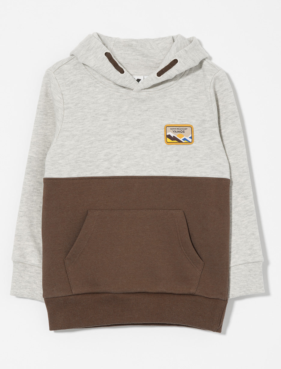 Colour block hoodie for teen boys, featuring a kangaroo pocket, a chest badge, and ribbed finishes at the edges. Perfect for cool, comfy moments.