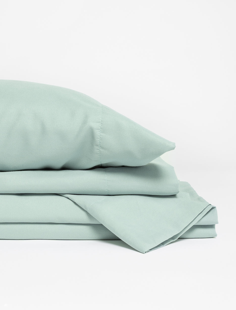 Double set including a flat sheet, a fitted sheet, and two matching pillowcases, designed for simple and comfortable nights.
