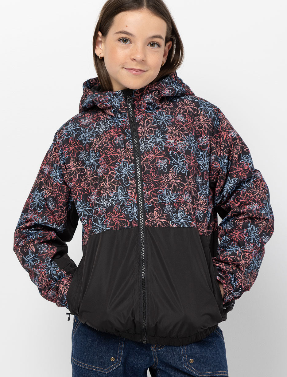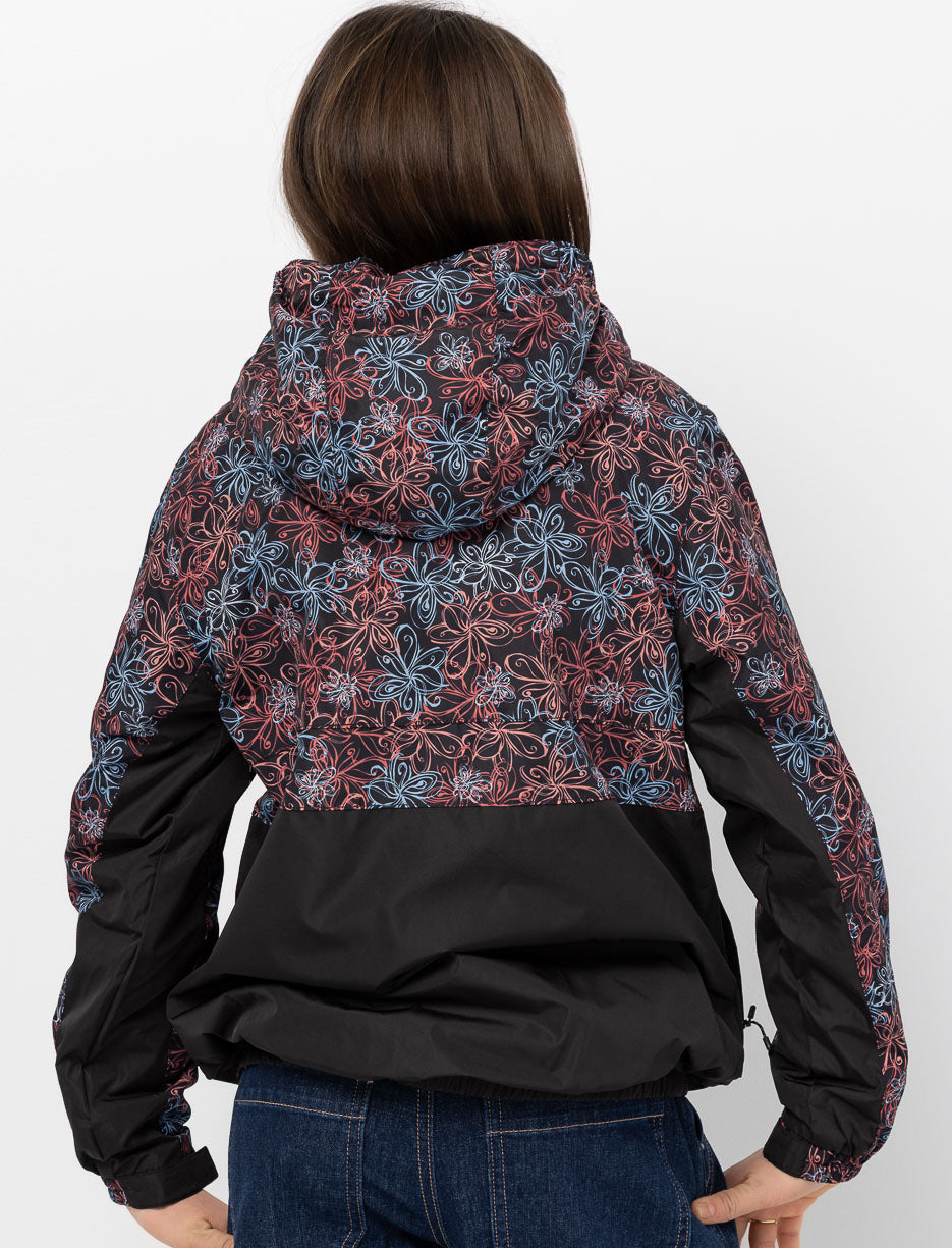 Lightweight spring jacket with a hood and floral design at the top, solid color base. Features two zip pockets and adjustable cuffs for optimal comfort. Warm fleece lining. Perfect for cool transitional days.