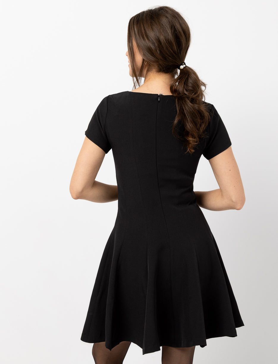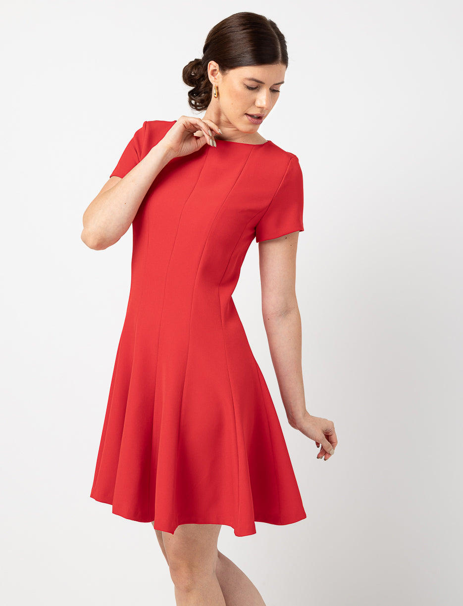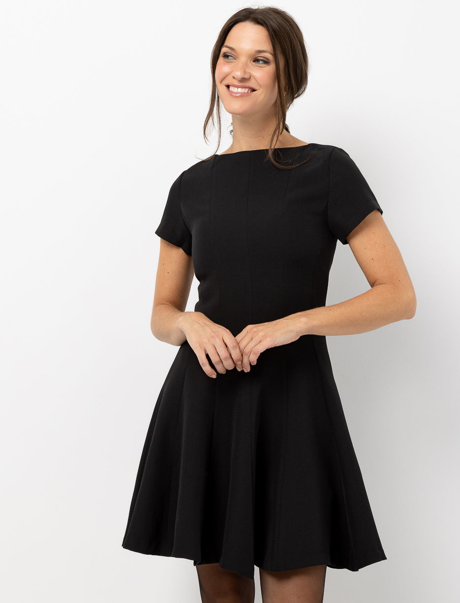 Discover a solid short sleeve dress fitted at the waist and flared with a godet. Its round neckline and back zip complete an elegant, feminine cut perfect for any occasion.