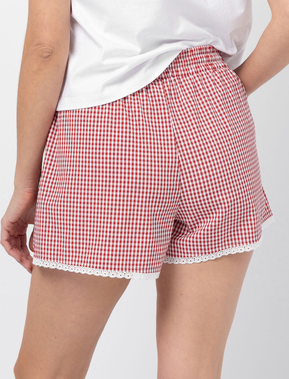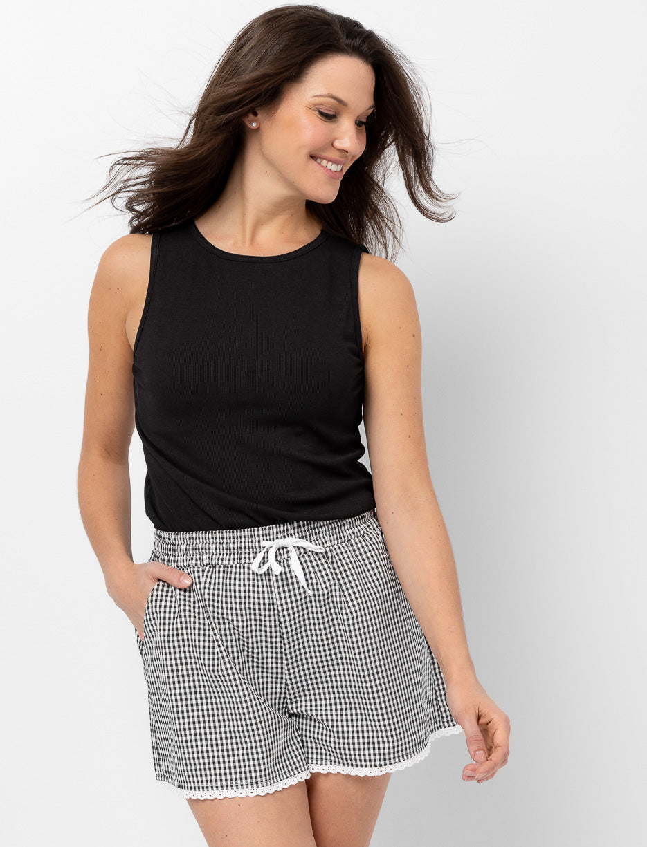 Comfortable shorts with an elastic waistband and drawstring for a personalized fit. Featuring two convenient side pockets and a delicate lace insert at the thighs for an elegant touch. Perfect for a casual style that combines comfort and everyday femininity.
