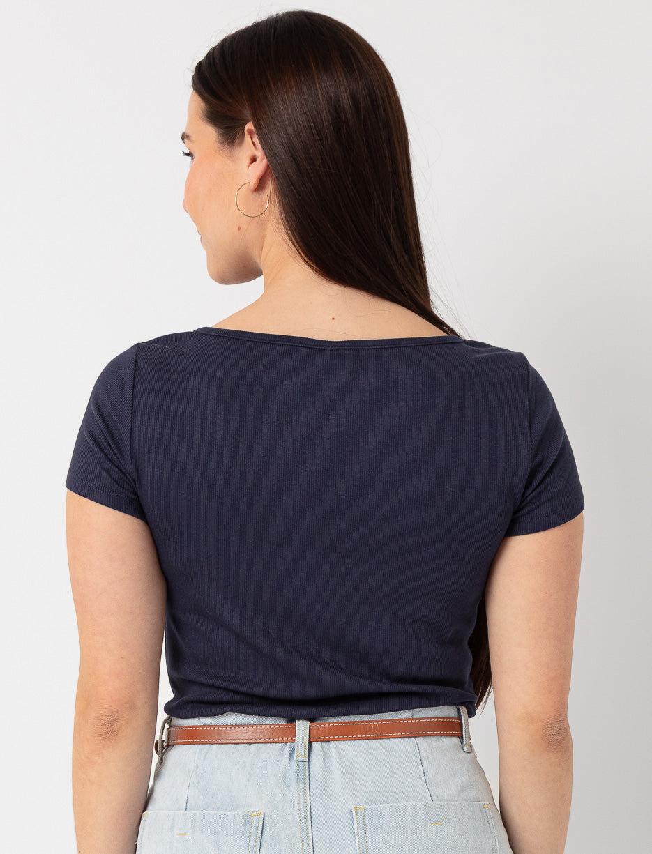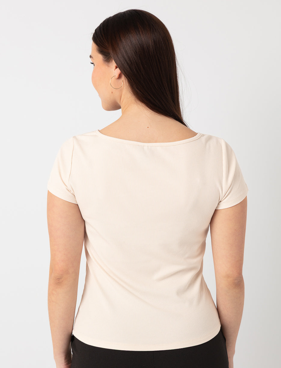 A boat neckline t-shirt with a fitted cut for a clean and minimalist look. Perfect for adding a subtle touch of elegance to everyday outfits.