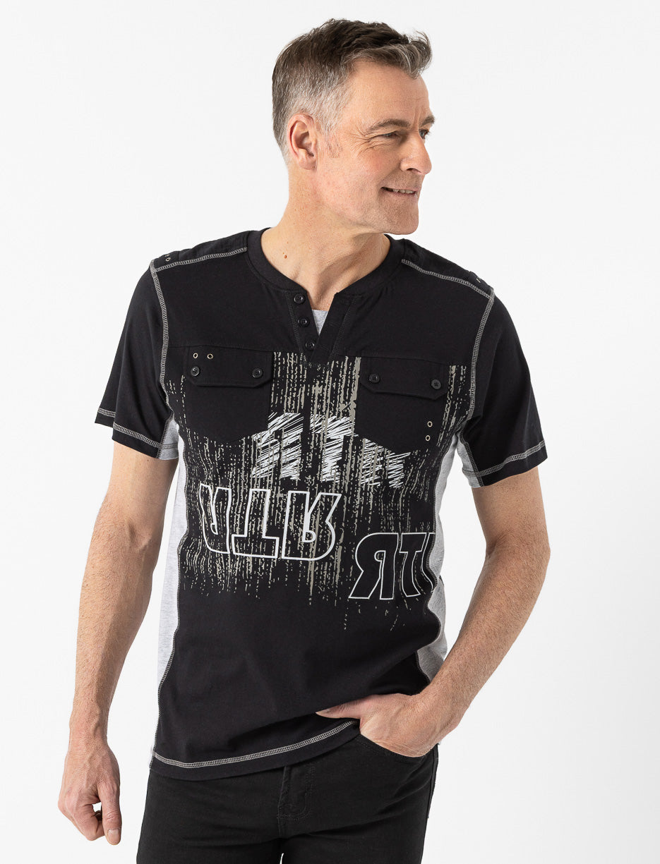 Add a bold twist to your everyday wardrobe with this graphic tee featuring chest pockets and button details. A comfortable fit that stands out effortlessly, perfect for those who like their basics with a bit of punch.