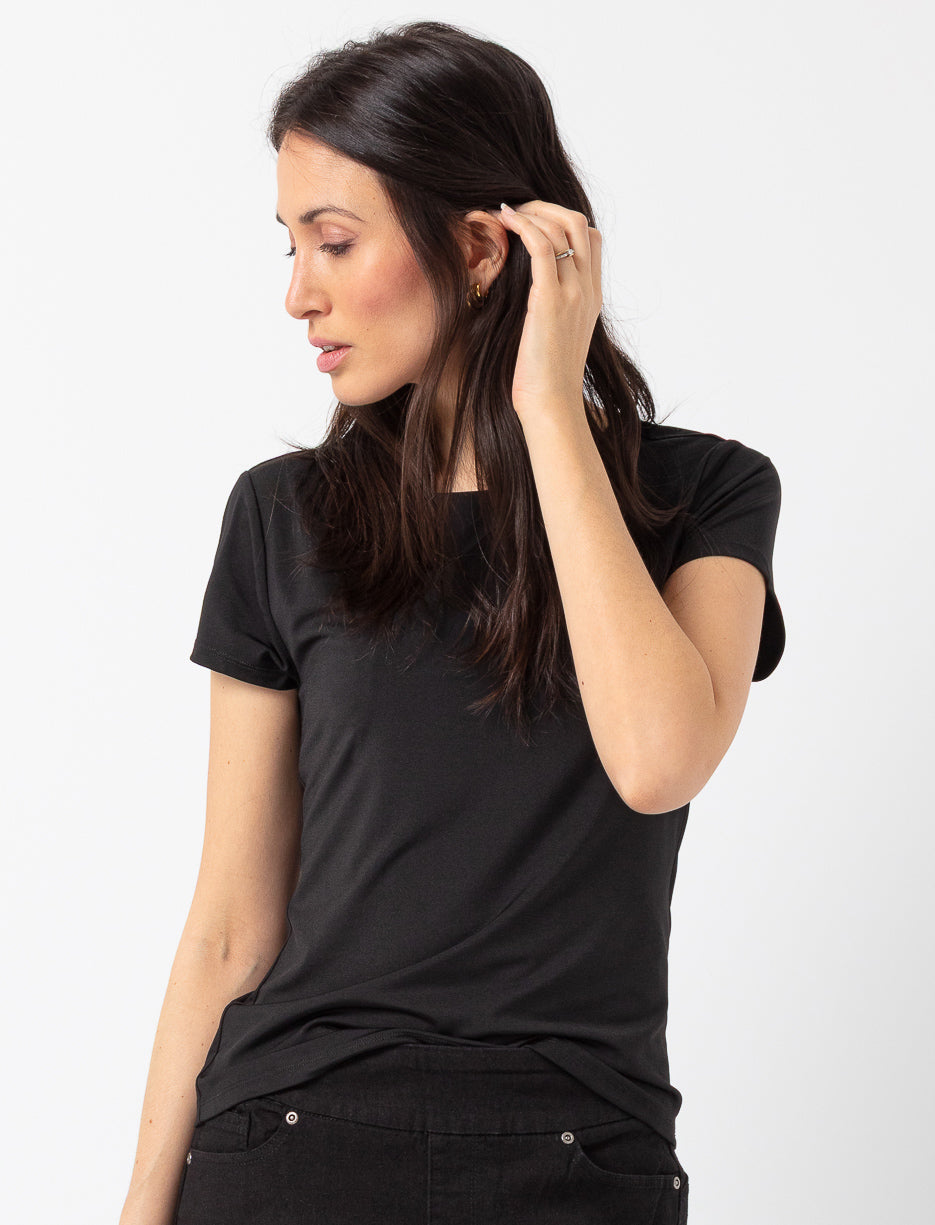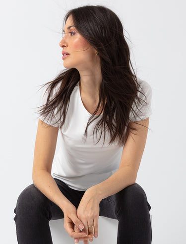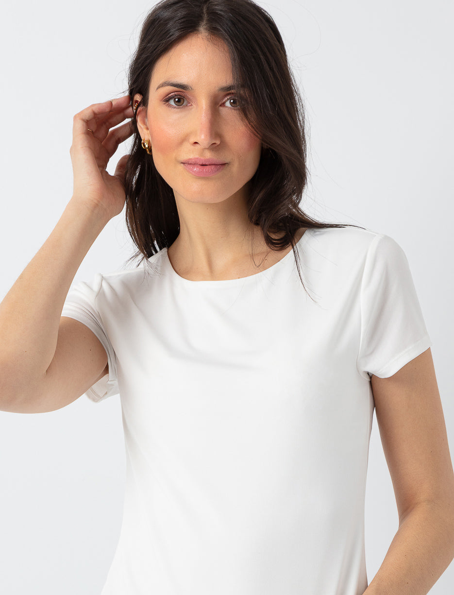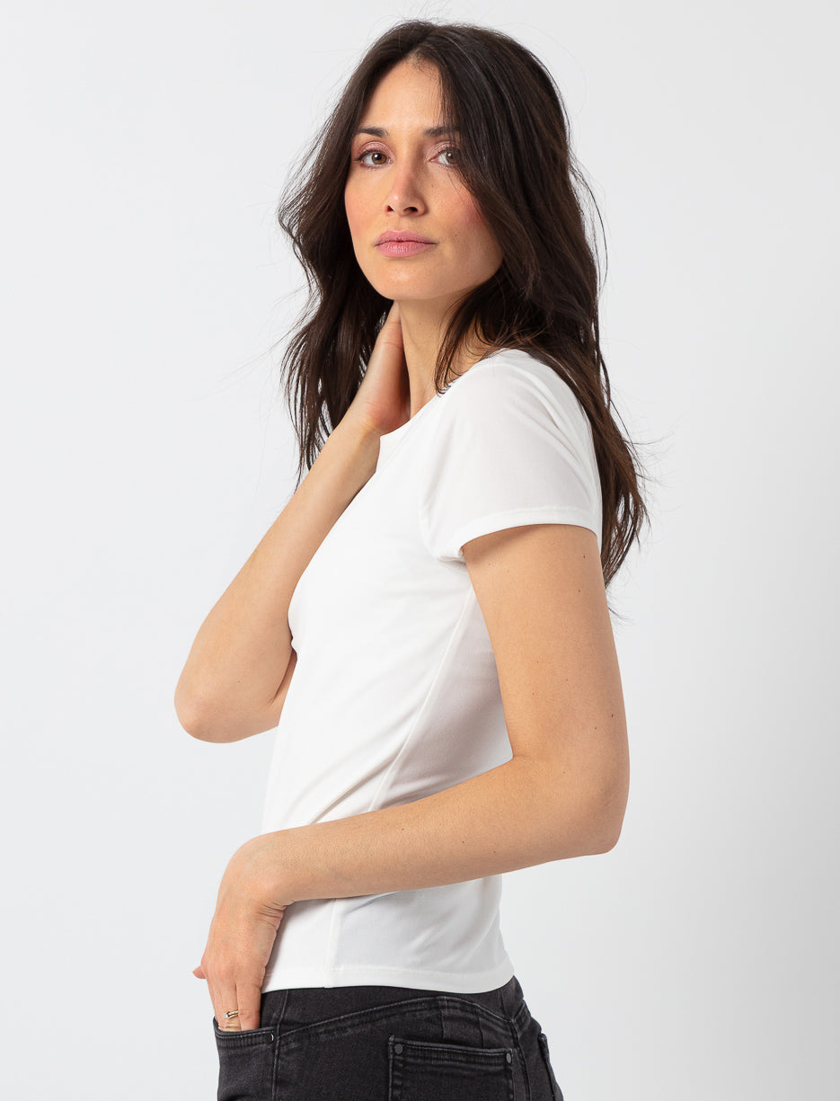 A versatile essential with all-day comfort. This fitted T-shirt hugs the body gently and pairs effortlessly with anything from jeans to blazers.