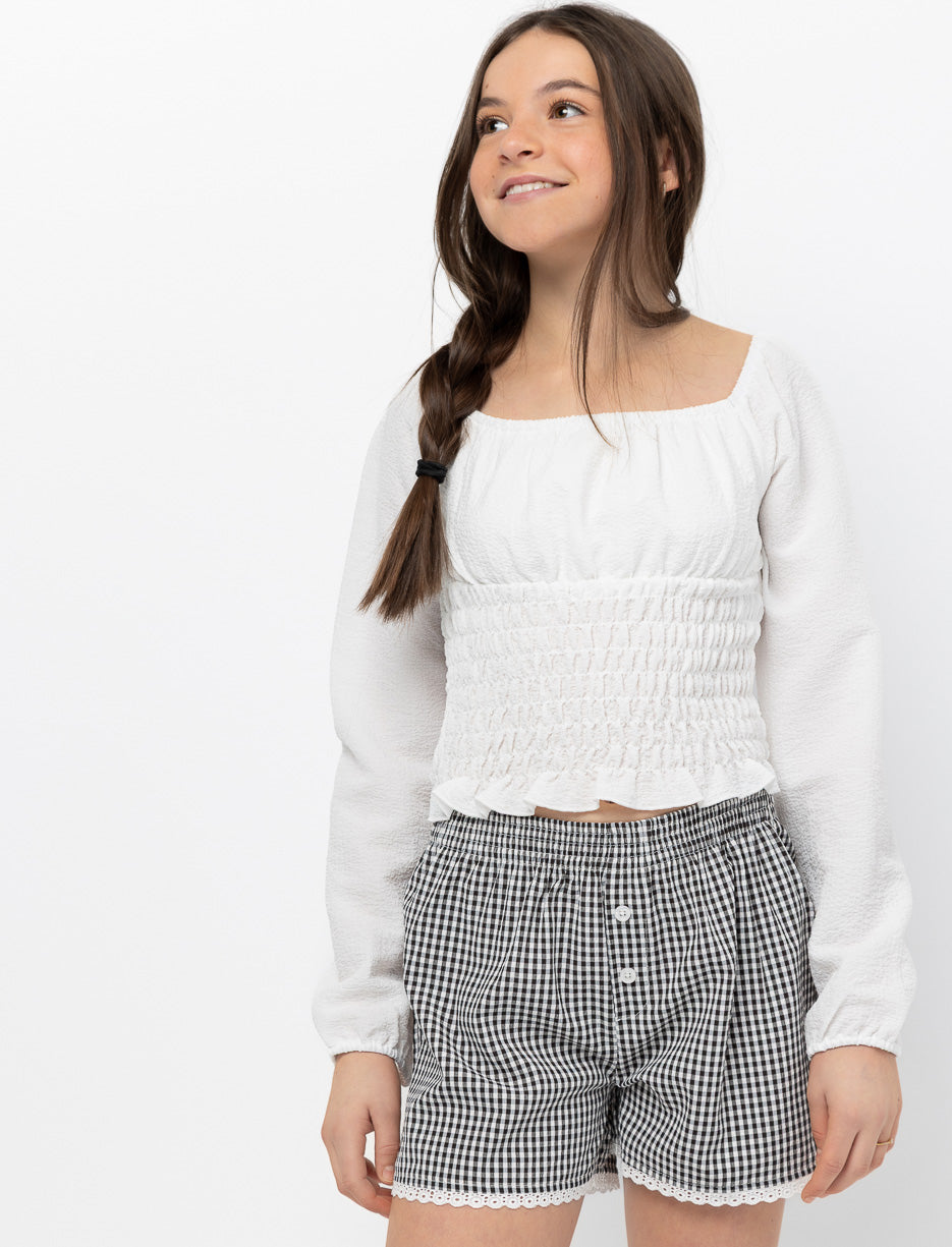 Discover this cropped T-shirt, perfect for teens who love to feel confident and stylish. Featuring long puff sleeves and a wide neckline, it delivers a trendy, modern look. The honeycomb-textured detail on the front and back adds visual interest and a unique touch. The shoulders can be worn on or off the shoulder, making this piece versatile and easy to style. Comfortable yet chic, it’s a must-have basic for every teen’s wardrobe.