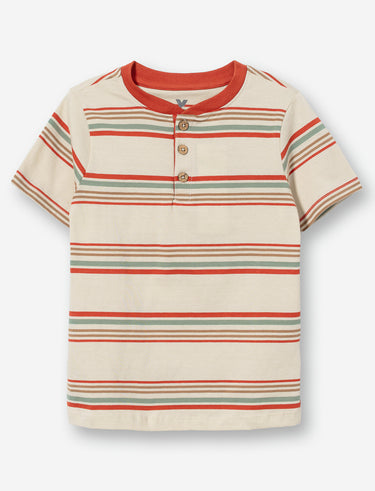 Short-sleeve T-shirt with a classic striped design. The button-front Henley collar adds a timeless, versatile style, perfect for casual days. Comfortable and easy to pull on, this T-shirt is a must-have in any young boy’s wardrobe.