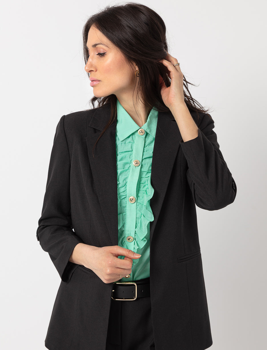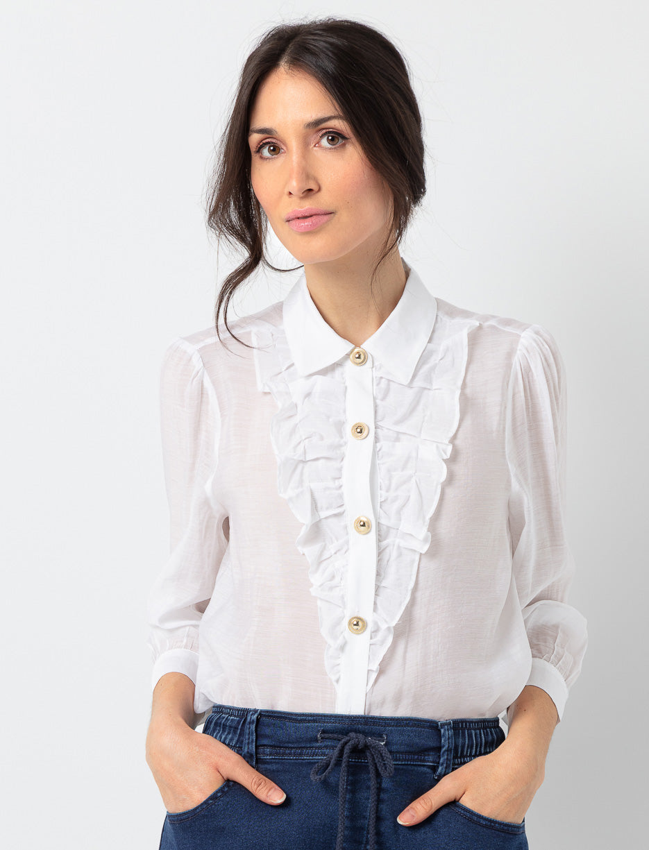 Une chemise qui mise sur les détails raffinés. Les volants et les boutons contrastants lui donnent une allure chic, idéale pour rehausser une tenue sans en faire trop.