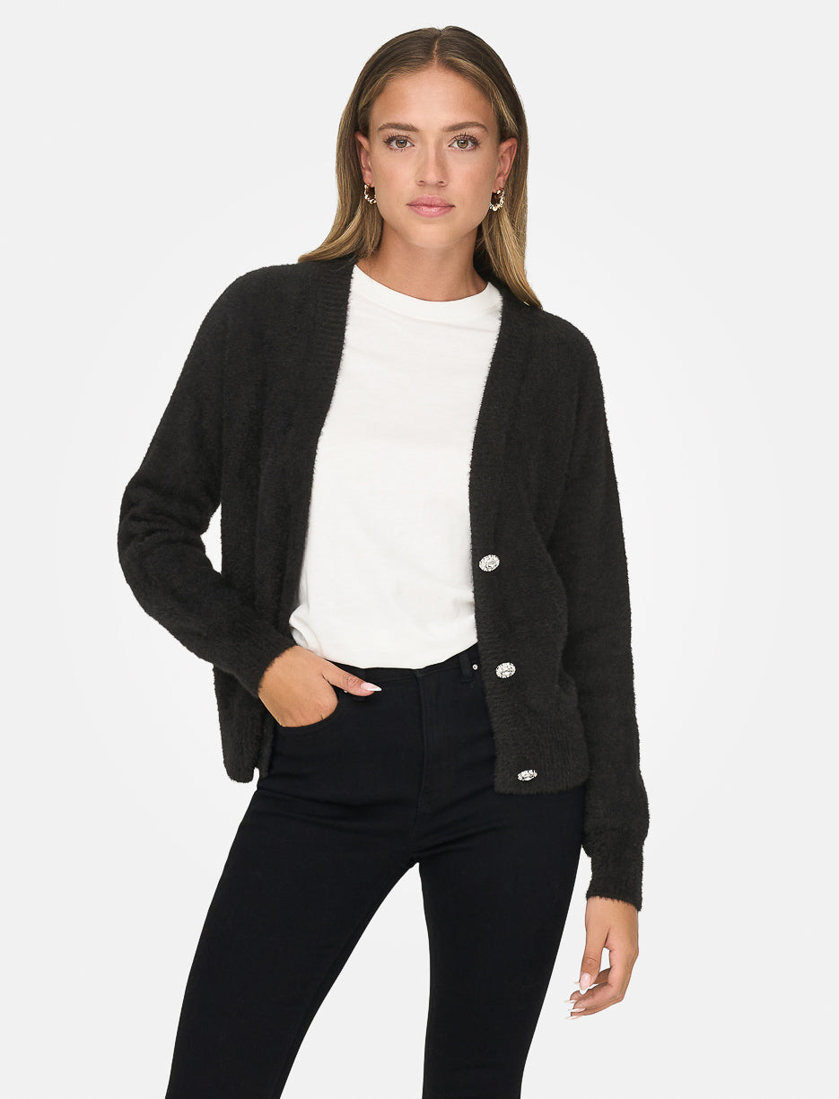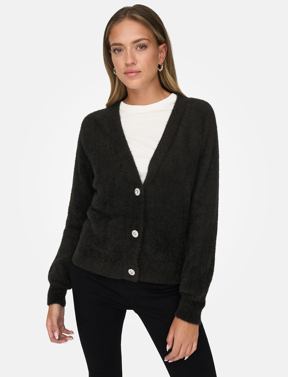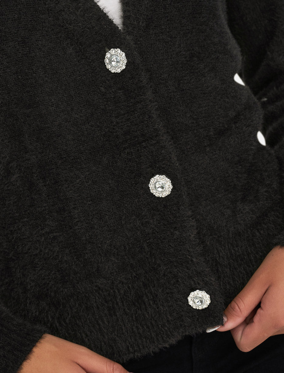 Le confort et l'éclat réunis dans ce cardigan doux orné de boutons bijoux. Une pièce élégante pour rehausser vos tenues du quotidien.
