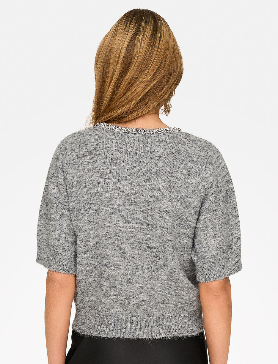 Conçu dans une maille douce et texturée, ce cardigan manches 2/4 se distingue par sa coupe courte moderne et ses boutons recouverts. L’encolure soulignée de strass apporte une finition raffinée.