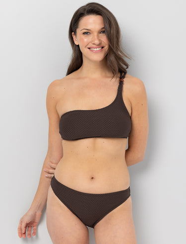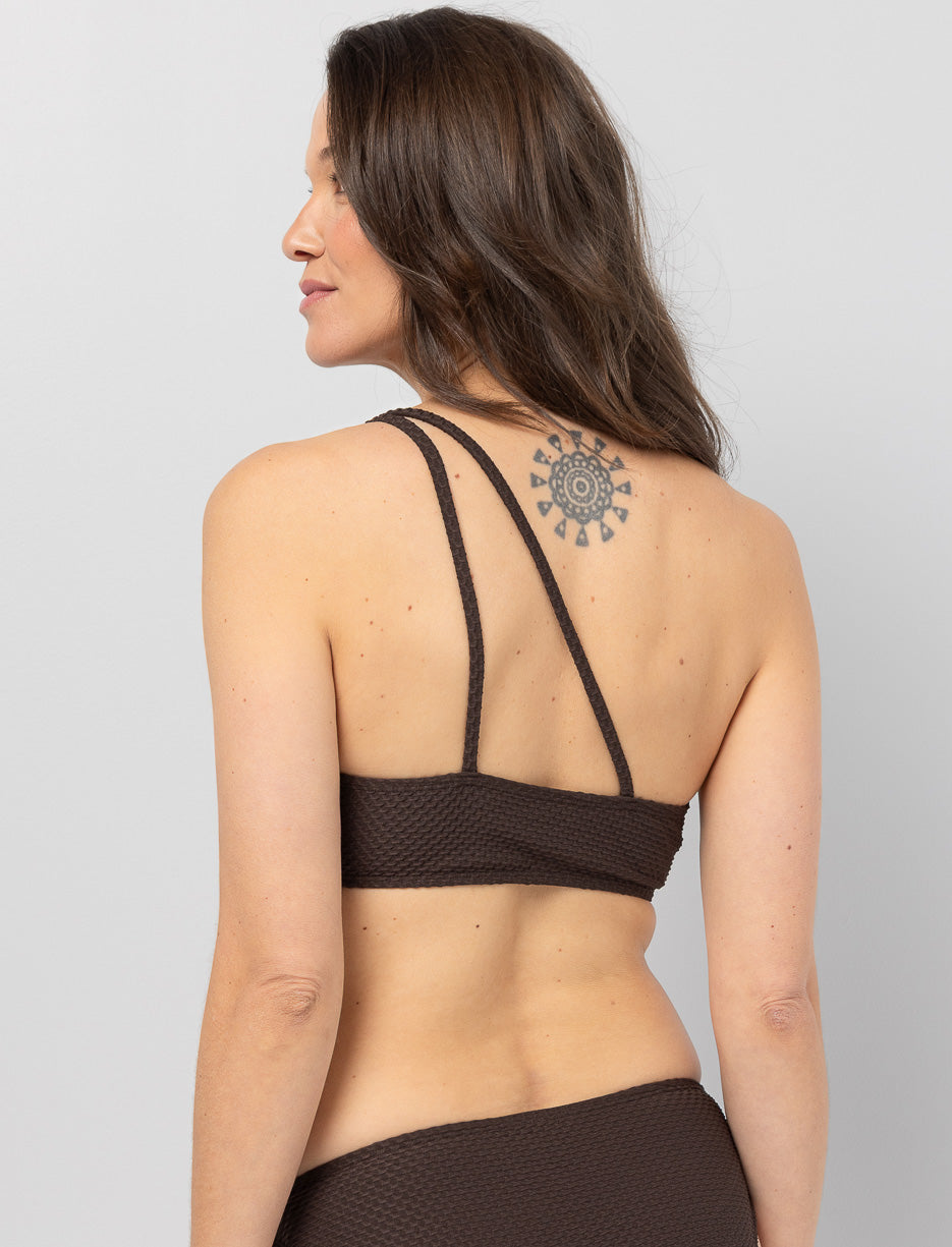 Un haut de bikini qui joue sur la simplicité et le détail. Sa texture subtile, sa coupe à une bretelle et sa bille en bois apportent une touche soignée, idéale pour un look balnéaire équilibré.