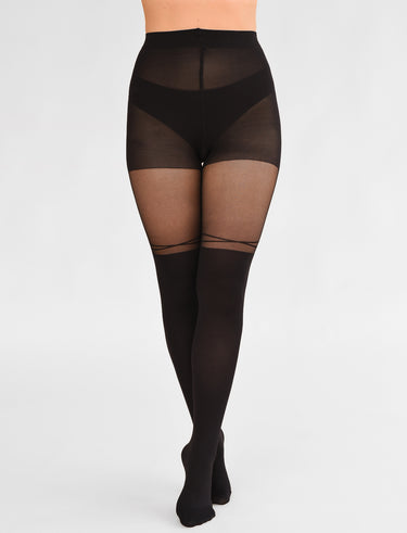 Ces collants élégants présentent un design imitant des cuissardes pour une magnifique touche raffinée. Parfaits pour ajouter une pointe de sophistication à vos tenues, ils allient style et confort pour un port quotidien.