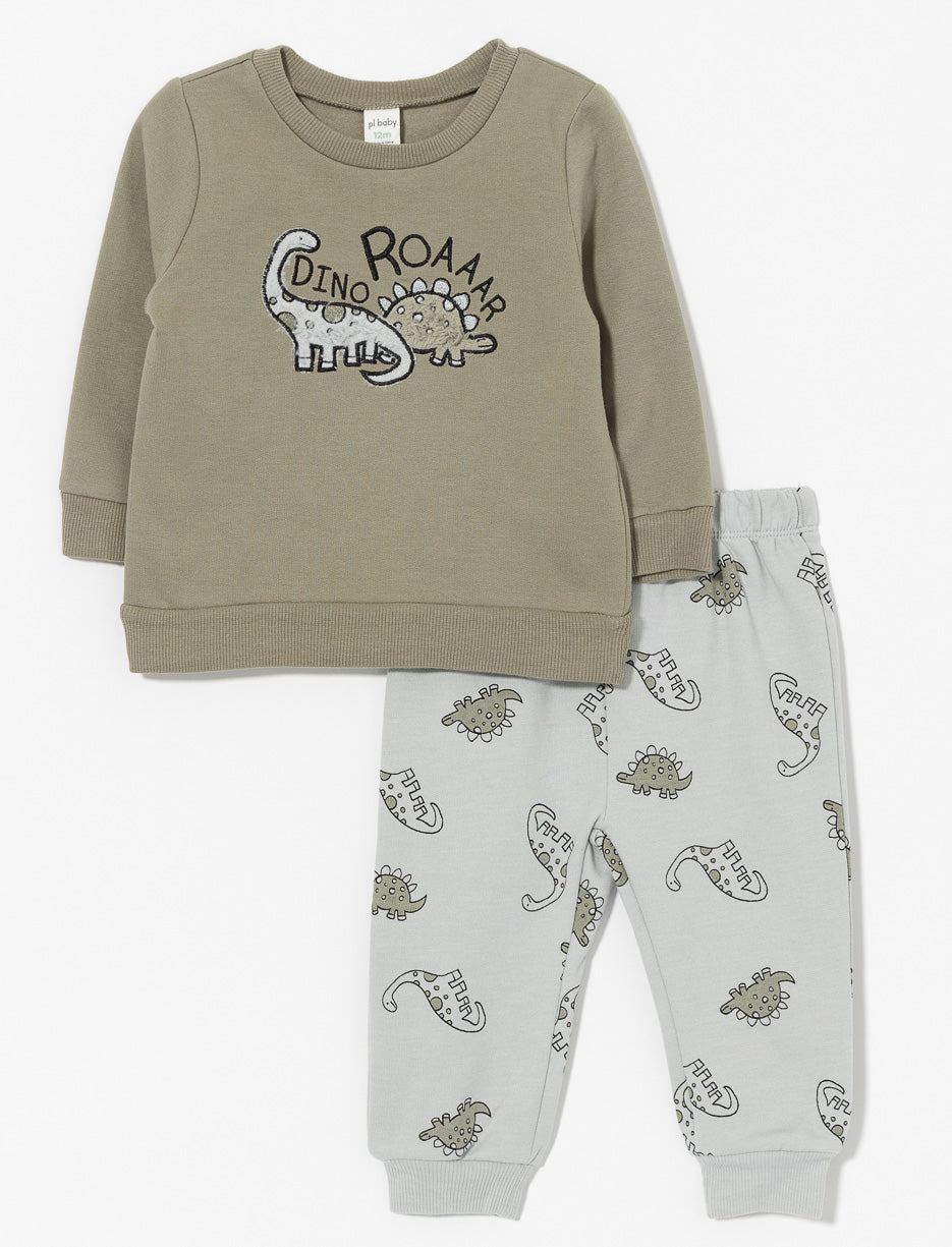 Cet ensemble 2 pièces comprend un chandail à manches longues décoré d’un dinosaure et un pantalon imprimé à taille élastique. Un look ludique et confortable pour votre petit explorateur.