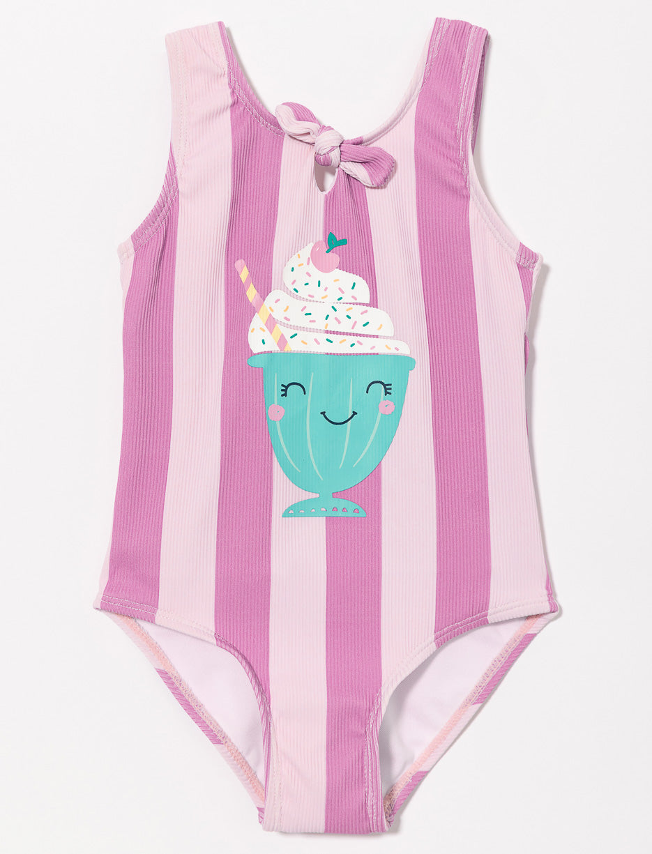 Maillot de bain 1 pièce à larges bretelles avec nœud à l’avant et dos ouvert. Son imprimé ludique et sa protection UV50 en font le choix parfait pour s’amuser au soleil avec style et confort.