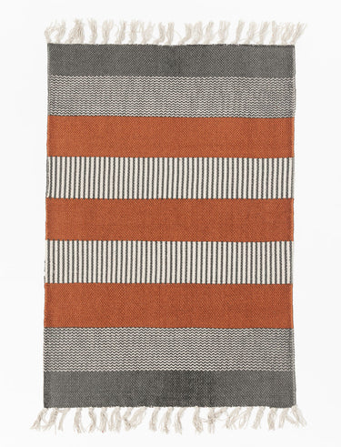 Tapis en jute à rayures contrastantes avec franges aux extrémités. Dimensions : 60 x 90 cm. Apporte une touche chaleureuse et texturée au décor.