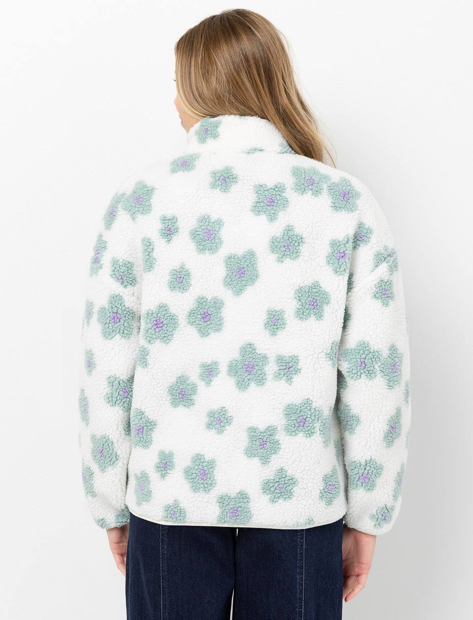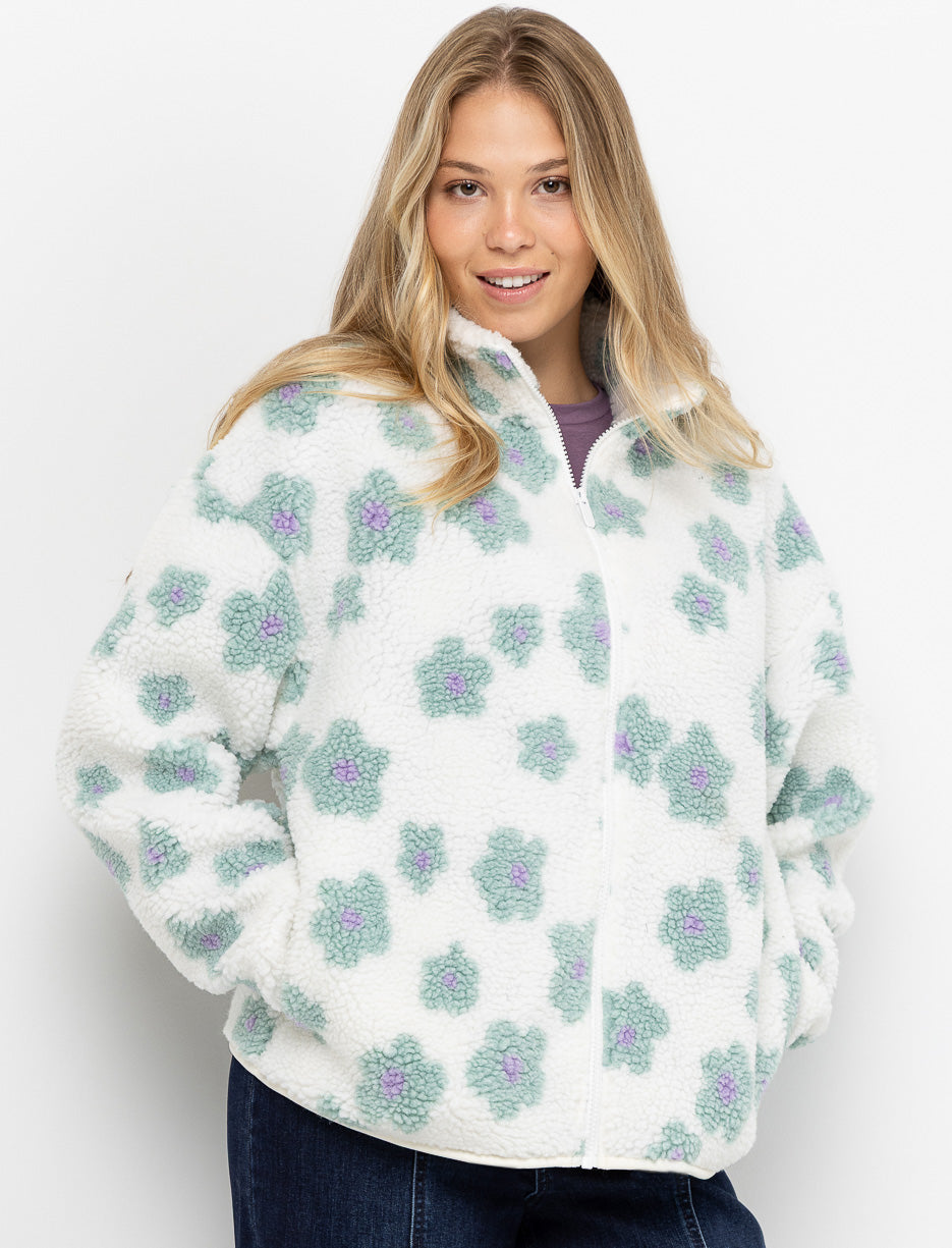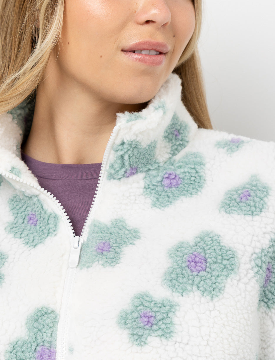 Enveloppez-vous de confort avec cette veste zippée en sherpa dotée d'un col montant qui épouse délicatement votre silhouette. Le motif floral ajoute une touche de féminité à votre garde-robe, tandis que les épaules tombantes créent une allure décontractée et élégante. Parfaite pour les journées fraîches, cette pièce polyvalente se marie facilement avec vos tenues préférées pour un style sans effort.