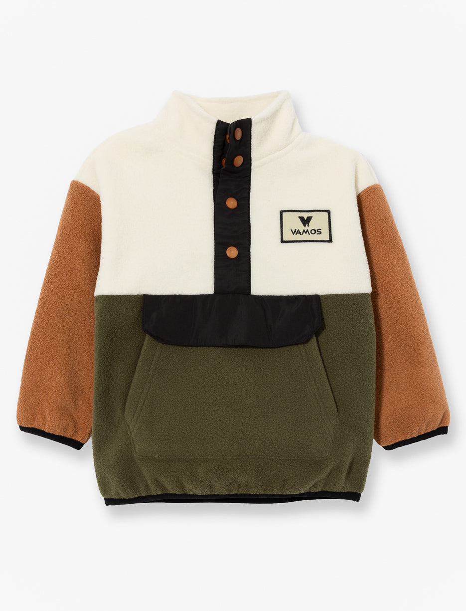 Chandail douillet en polar pour bébé garçon avec design color block moderne. Manches longues et épaules tombantes pour un confort optimal. Col montant avec demi fermeture à boutons et poche kangourou. Parfait pour les journées fraîches.