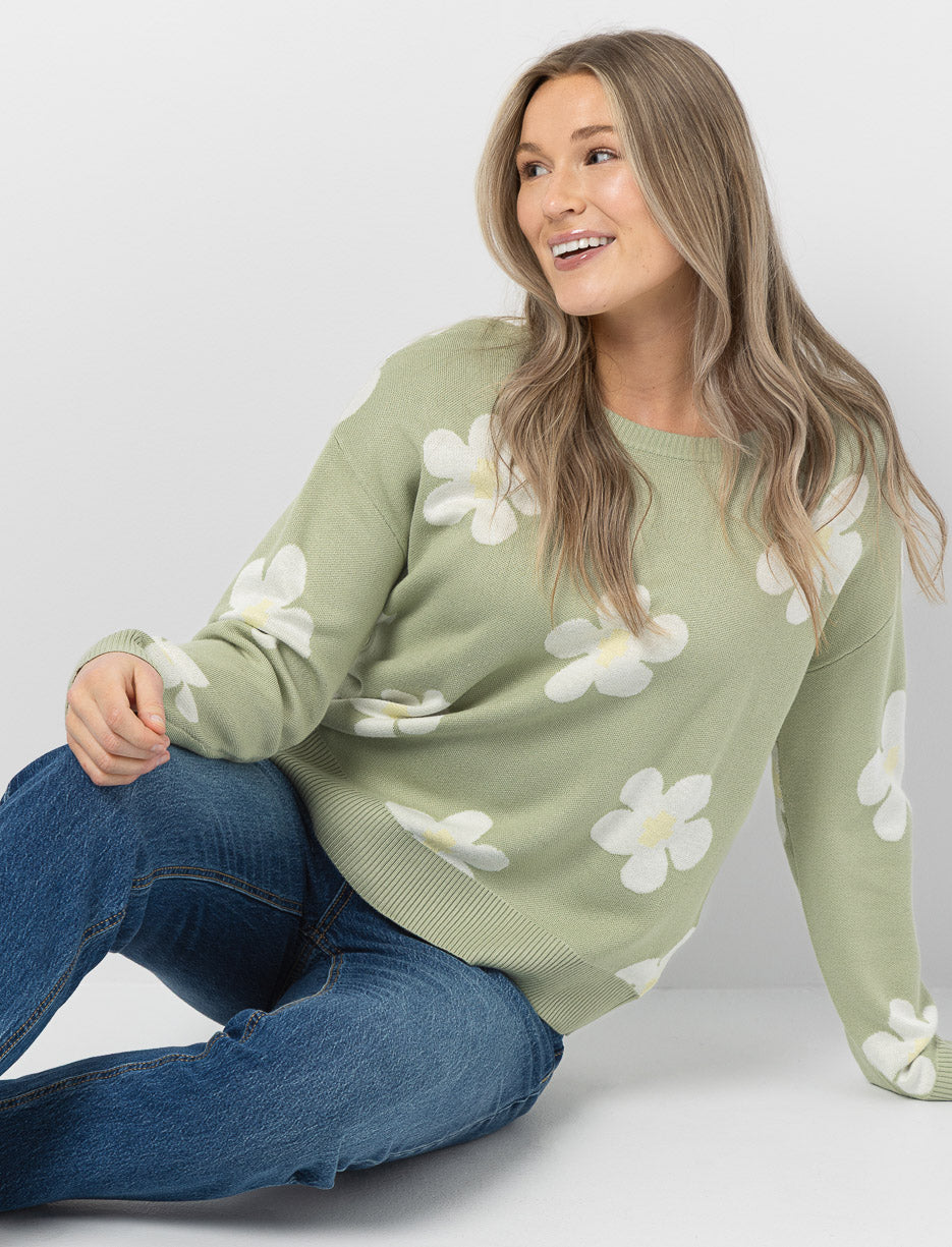 Un chandail en tricot doux à manches longues et épaules tombantes. Son col rond et ses fleurs délicates ajoutent une touche de charme aux journées fraîches.